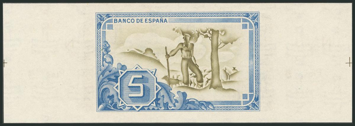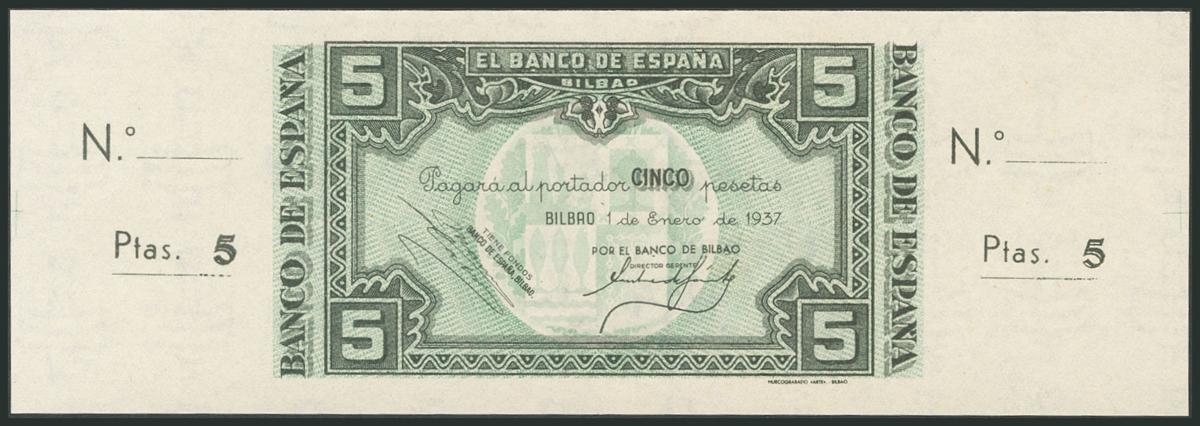 5 Pesetas. 1 de Enero de 1937. Sucursal de Bilbao, antefirma Banco de Bilbao. Sin serie y sin numeración, con ambas matrices. (Edifil 2017: 385c). SC.
