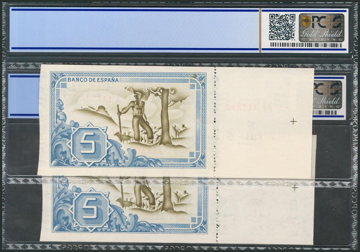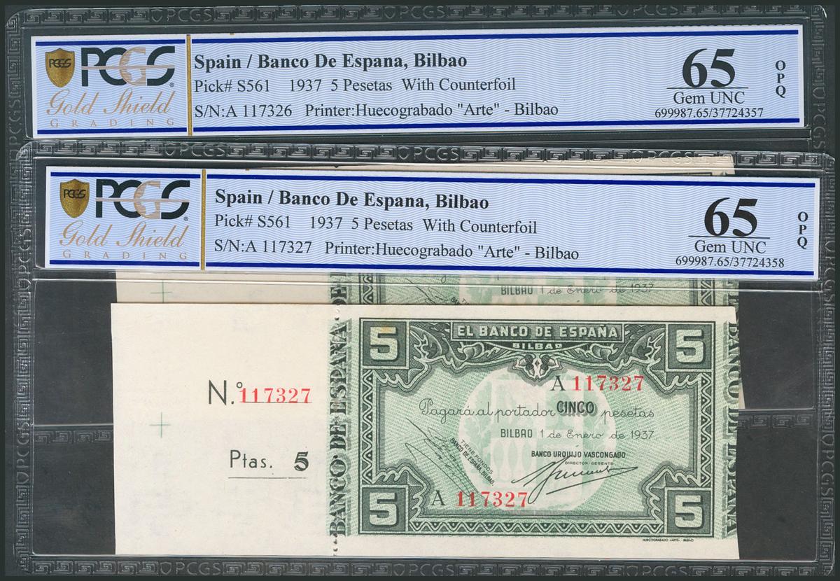 5 Pesetas. 1 de Enero de 1937. Banco de España, Bilbao. Antefirma Banco Urquijo Vascongado. Pareja correlativa, con matriz a la izquierda. (Edifil 2017: 386f). Encapsulados PCGS65OPQ, ambos. SC.