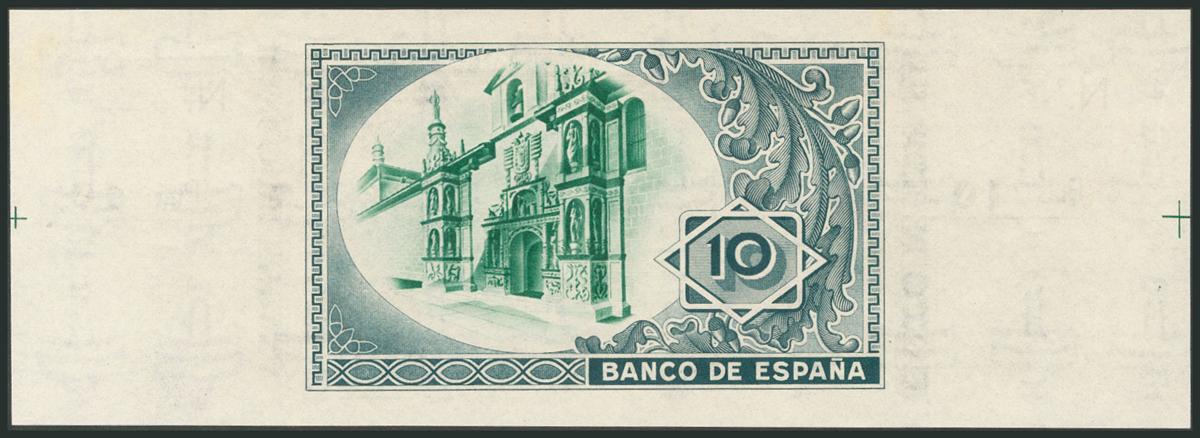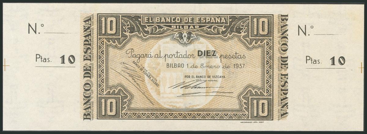 10 Pesetas. 1 de Enero de 1937. Sucursal de Bilbao, antefirma Banco de Vizcaya. Sin serie y sin numeración, con ambas matrices. (Edifil 2017: 387b). SC.