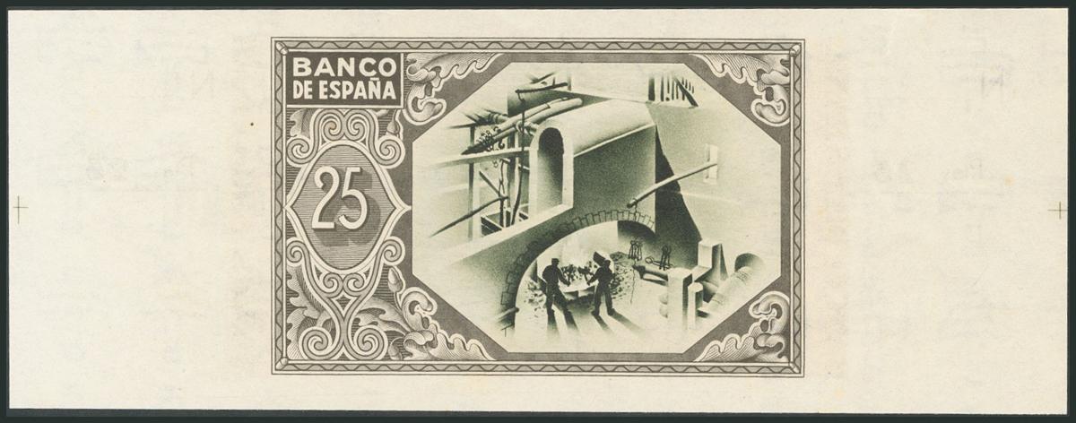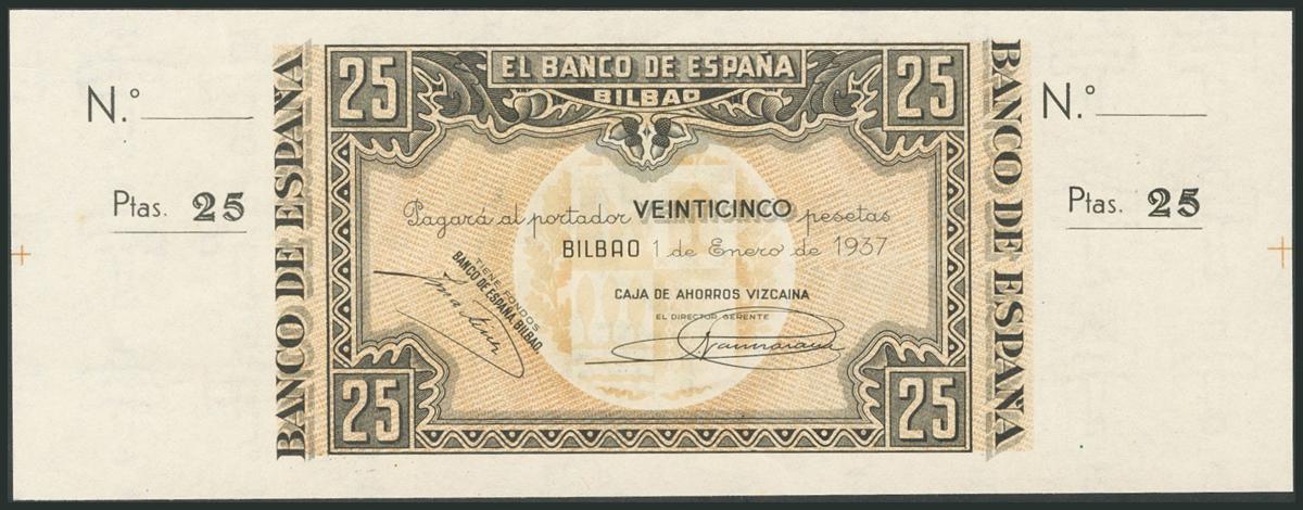 25 Pesetas. 1 de Enero de 1937. Sucursal de Bilbao, antefirma Caja de Ahorros Vizcaína. Sin serie y sin numeración, con ambas matrices. (Edifil 2017: 388a). SC.