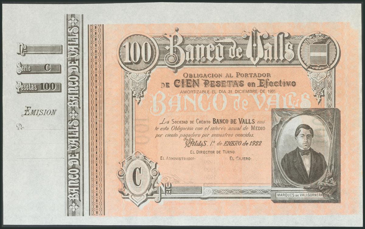 100 Pesetas. 1 de Abril de 1892. Banco de Valls. Serie C. (Ruiz y Alentorn: 927). SC-.