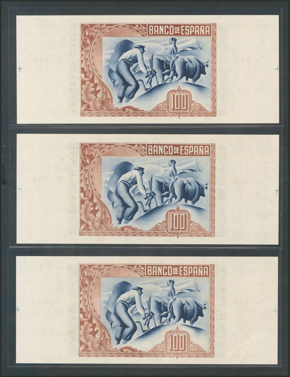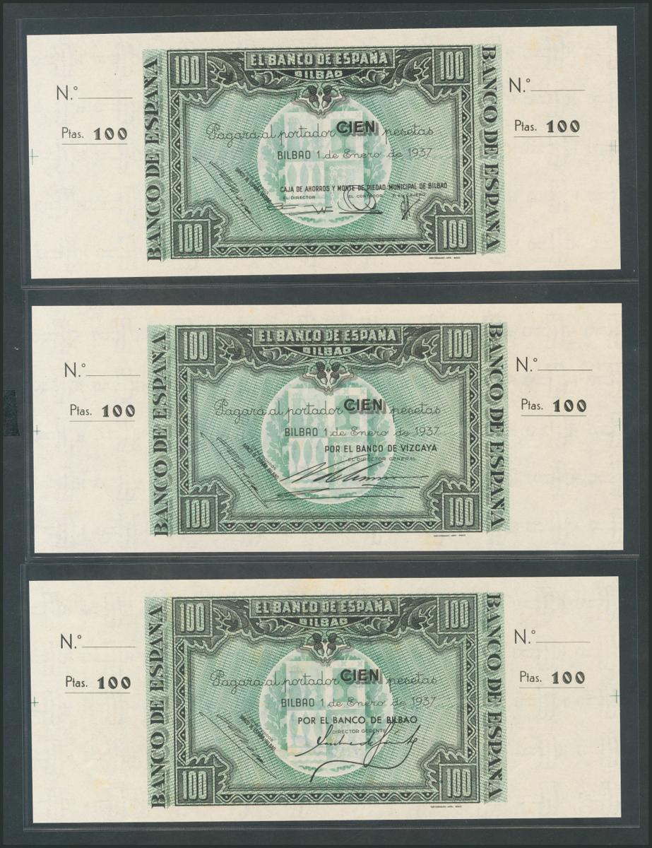 Conjunto de 3 billetes de 100 Pesetas emitidos por el Banco de España en la sucursal de Bilbao el 1 de Enero de 1937, incluyendo las 3 antefirmas conocidas, sin serie y sin numeración, con ambas matrices (Edifil 2017: 390a/c). Inusual conjunto. SC-.