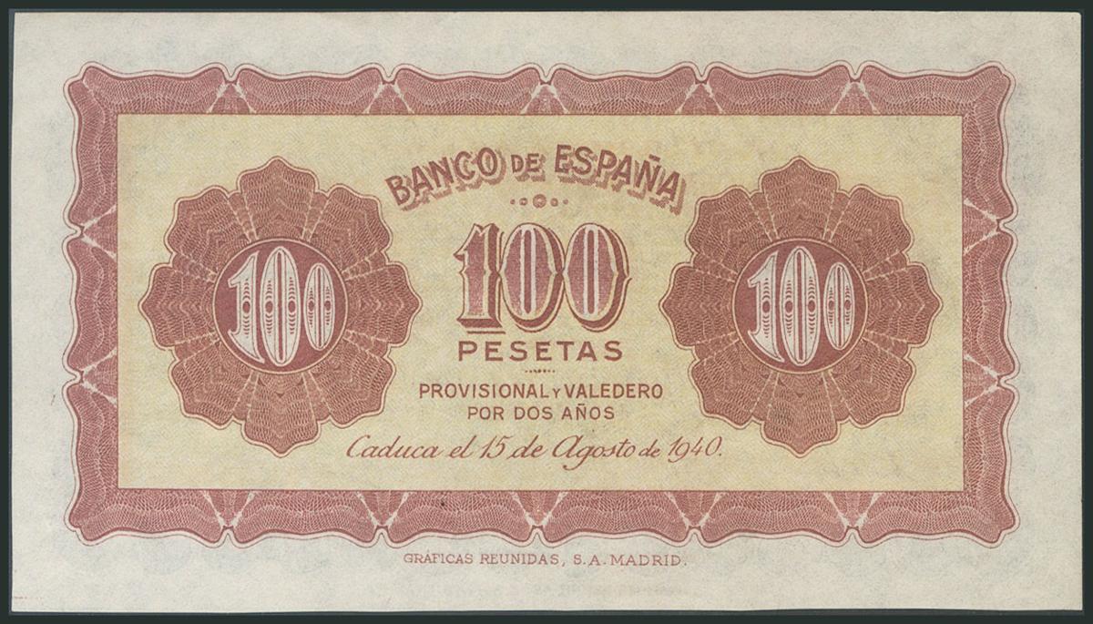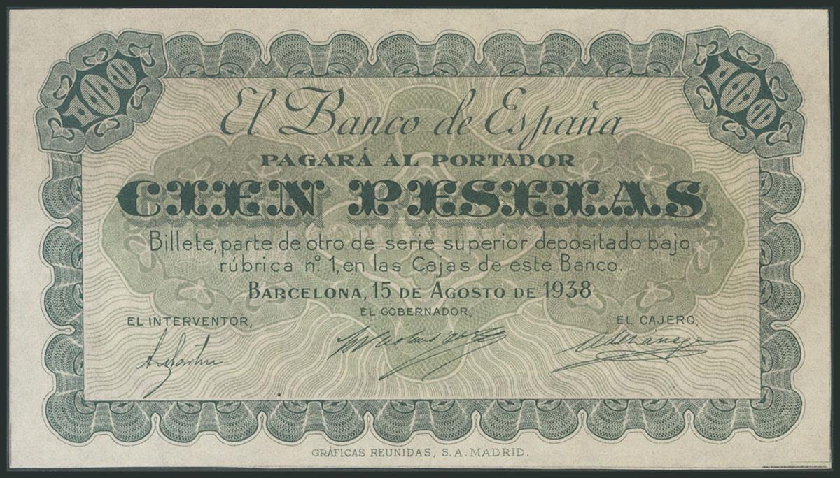 100 Pesetas. 15 de Agosto de 1938. Billete Provisional por 2 años no emitido del Banco de España, Barcelona. Sin serie. (Edifil 2017: NE37). Estaba prevista la emisión de este billete con origen en la sucursal catalana de Barcelona, el cual se llegó a imprimir en los talleres de Gráficas Reunidas de Madrid, debido a los avatares de la Guerra Civil no llegó a ser emitido y fueron destruídos, sólo se conocen escasísimos ejemplares, el catálogo Edifil menciona tres combinaciones de color. SC-.