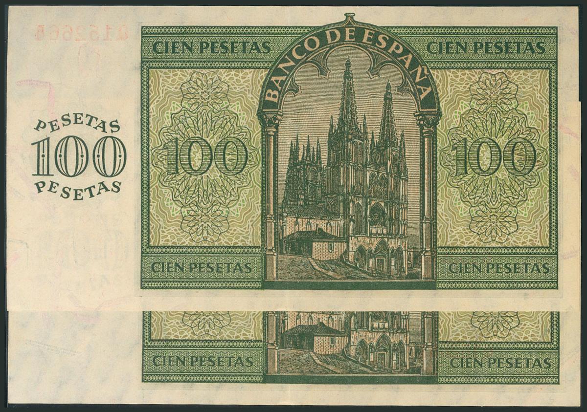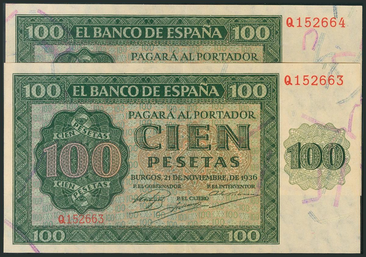 100 Pesetas. 21 de Noviembre de 1936. Banco de España, Burgos. Serie Q. Pareja correlativa. (Edifil 2017: 421a). Apresto original. EBC+.