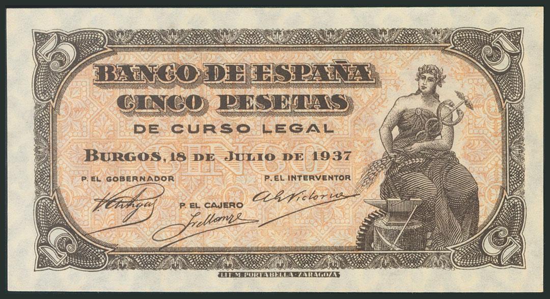 5 Pesetas. 18 de Julio de 1937. Sin serie. (Edifil 2017: 424). Apresto original. SC.