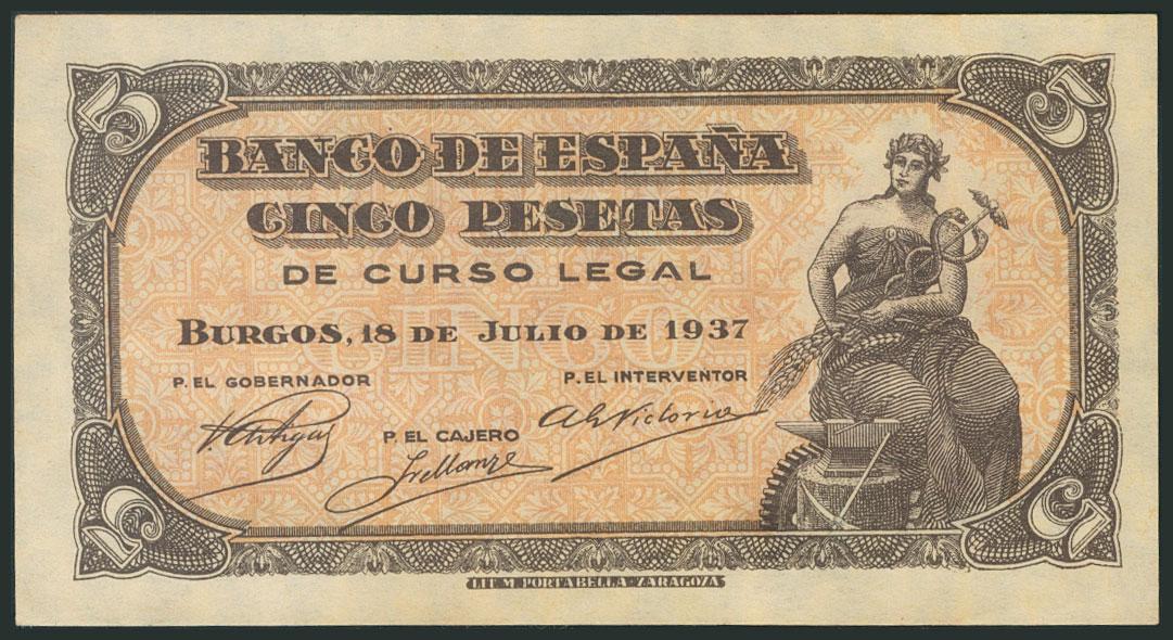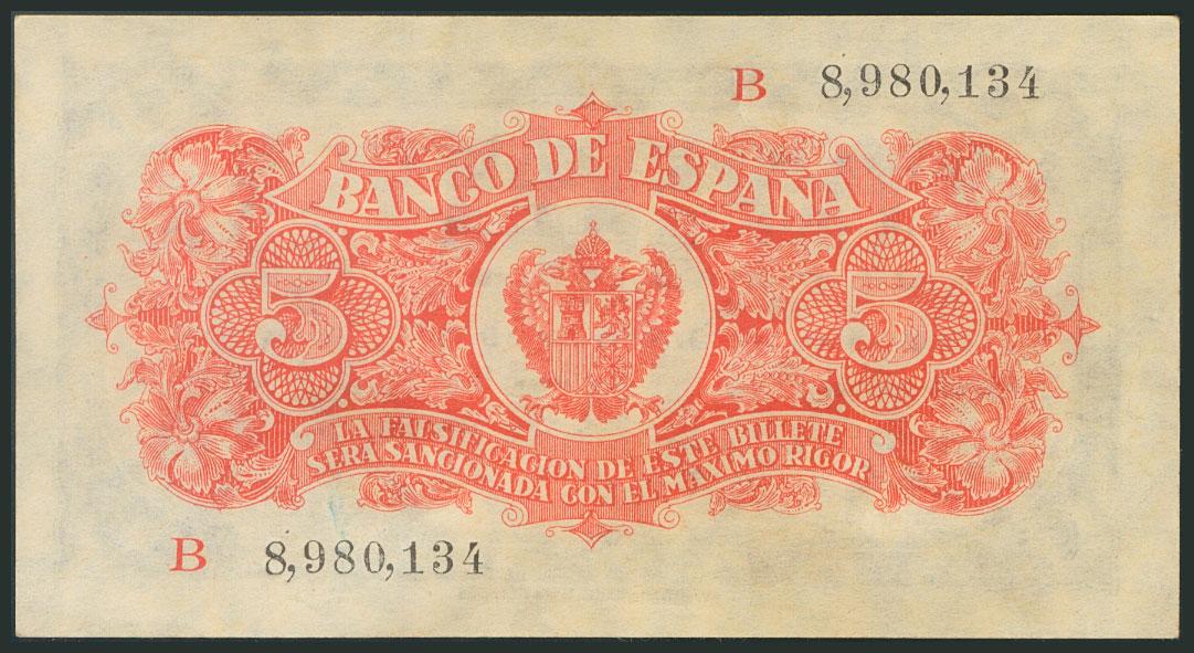 5 Pesetas. 18 de Julio de 1937. Serie B. (Edifil 2017: 424a). Apresto original. EBC+.