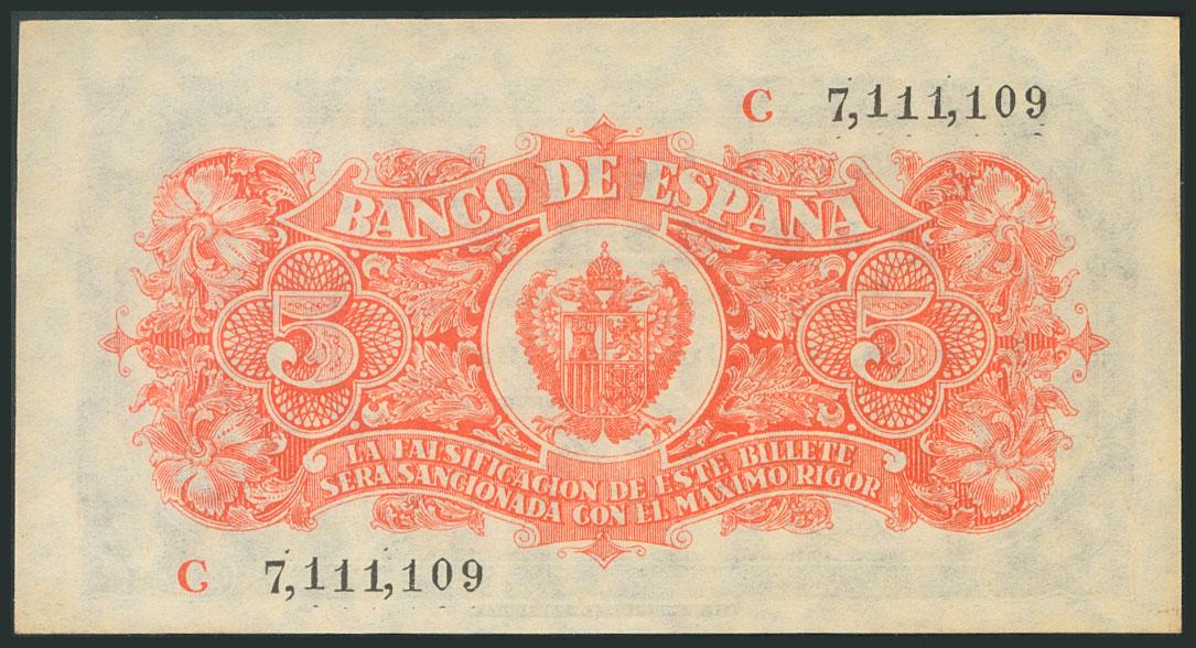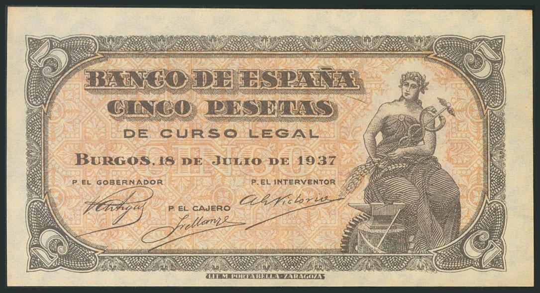 5 Pesetas. 18 de Julio de 1937. Serie C, última serie emitida. (Edifil 2017: 424a). Ligerísimamente tonalizado. SC-.