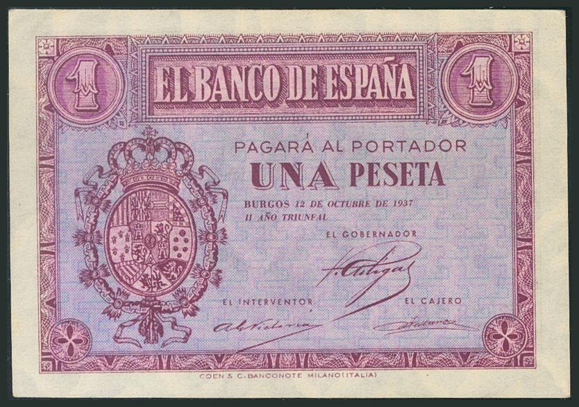 1 Peseta. 12 de Octubre de 1937. Serie D. (Edifil 2017: 425a). EBC+.