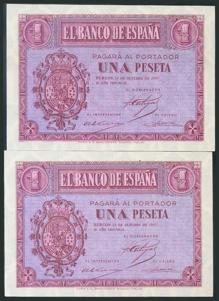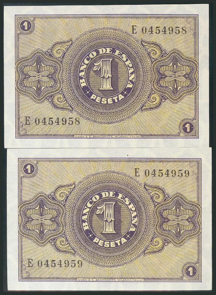 1 Peseta. 12 de Octubre de 1937. Pareja correlativa. Serie E. (Edifil 2017: 425a). SC.