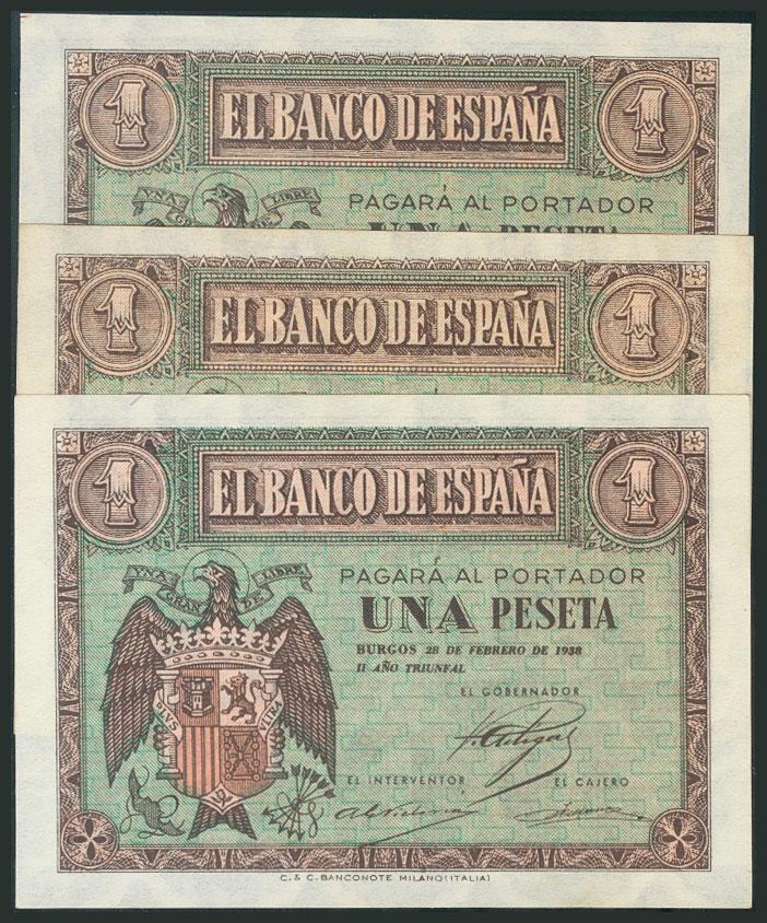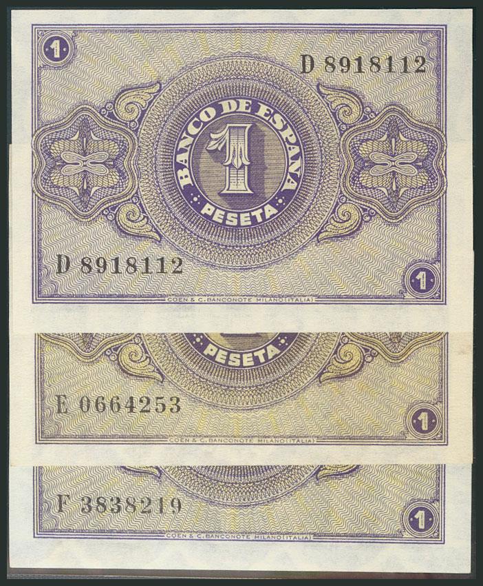 Conjunto de 3 billetes de 1 Peseta emitidos el 28 de Febrero de 1938, con las series D, E y F. (Edifil 2017: 427a). SC.