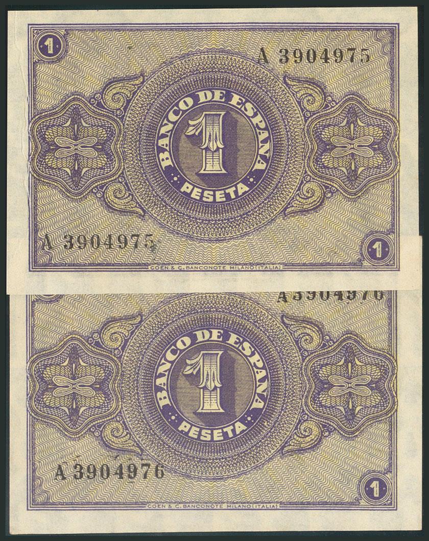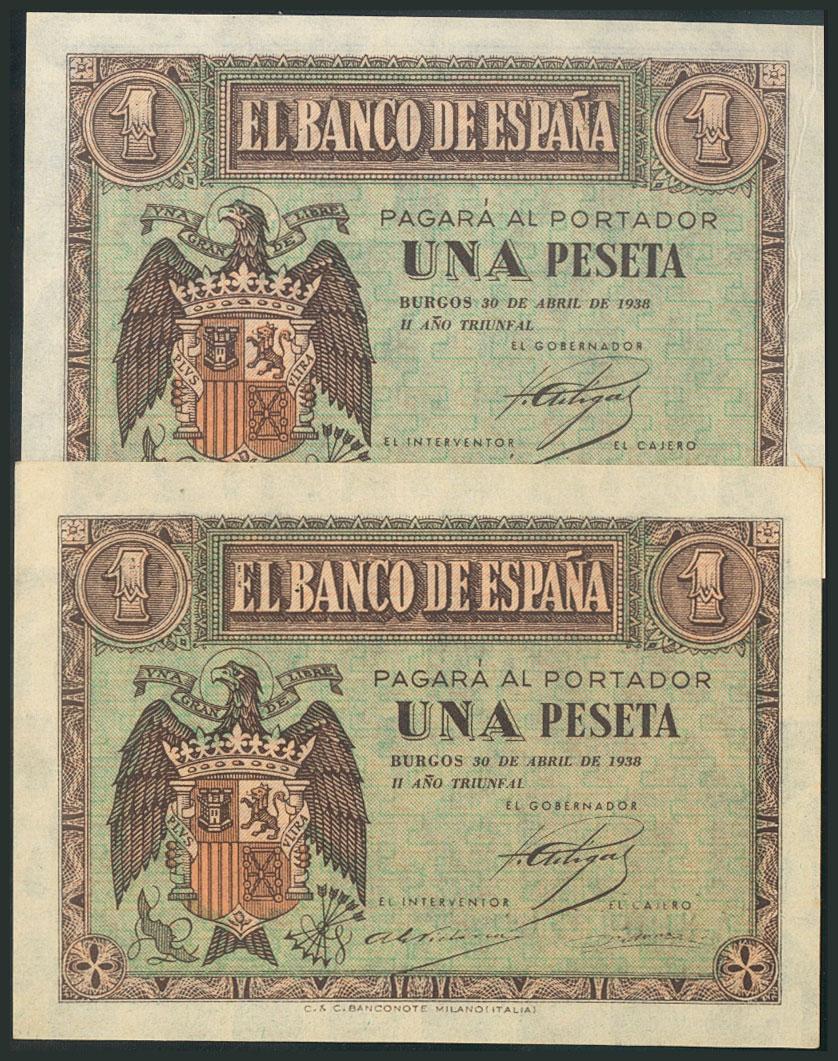 1 Peseta. 30 de Abril de 1938. Pareja correlativa. Serie A. (Edifil 2017: 428). Apresto original. EBC+.