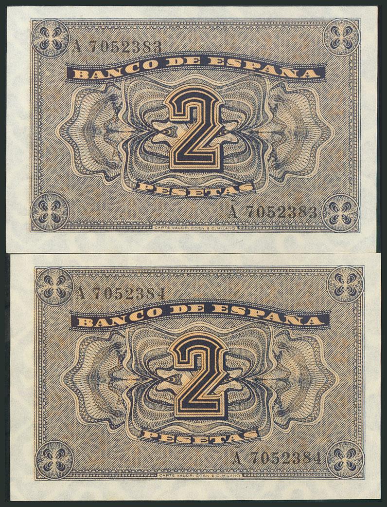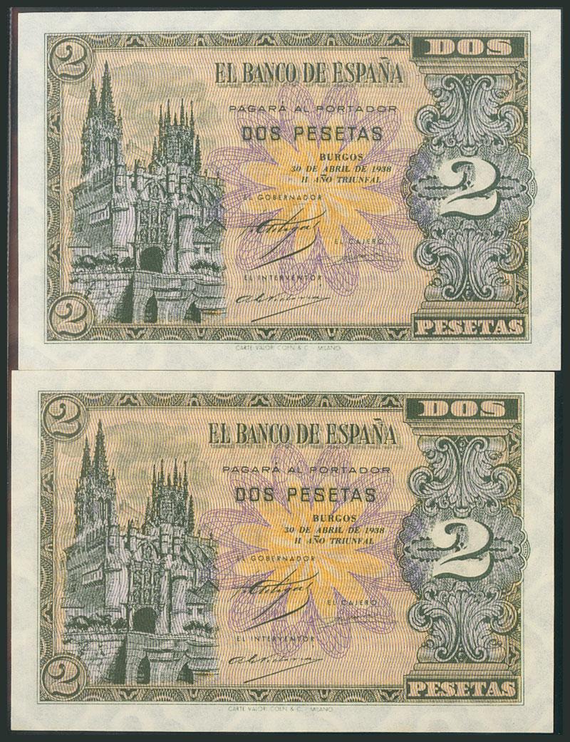 2 Pesetas. 30 de Abril de 1938. Pareja correlativa. Serie A. (Edifil 2017: 429). Apresto original. SC.