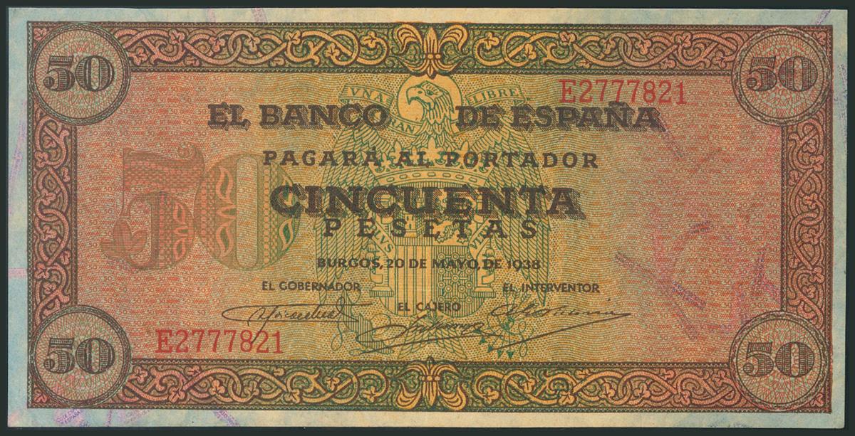 50 Pesetas. 20 de Mayo de 1938. Serie E. (Edifil 2017: 431a). Conserva todo su apresto original. EBC.