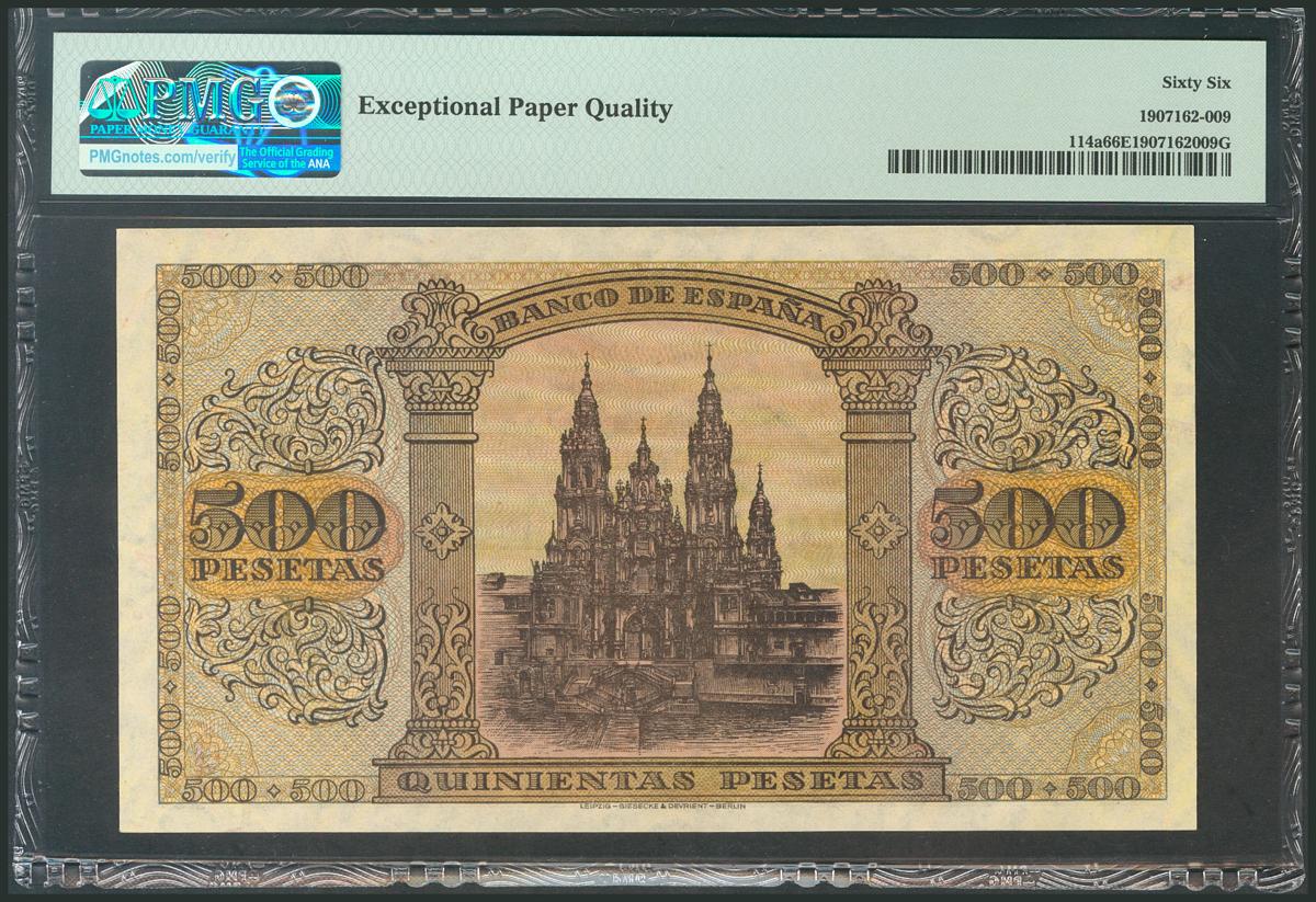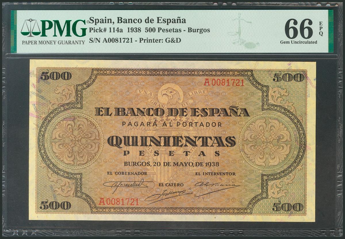 500 Pesetas. 20 de Mayo de 1938. Serie A. (Edifil 2017: 433). Conserva todo su apresto original. Muy raro, especialmente en esta excepcional calidad. SC+. Encapsulado PMG66EPQ. (para hacerse una idea de la rareza del billete en esta calidad, PMG otorga a día 1 de Septiembre de 2020 la segunda mejor calificación a este billete, sólo superado por un billete que se graduó con 67EPQ).