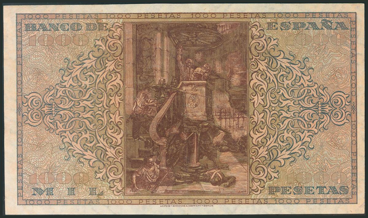 1000 Pesetas. 20 de Mayo de 1938. Serie A. (Edifil 2017: 434). Expertamente planchado en el pliegue central, dándole un aspecto espectacular y muy superior a la conservación real, con un apresto muy plano y con falta de viveza. MBC+, en su estado original.