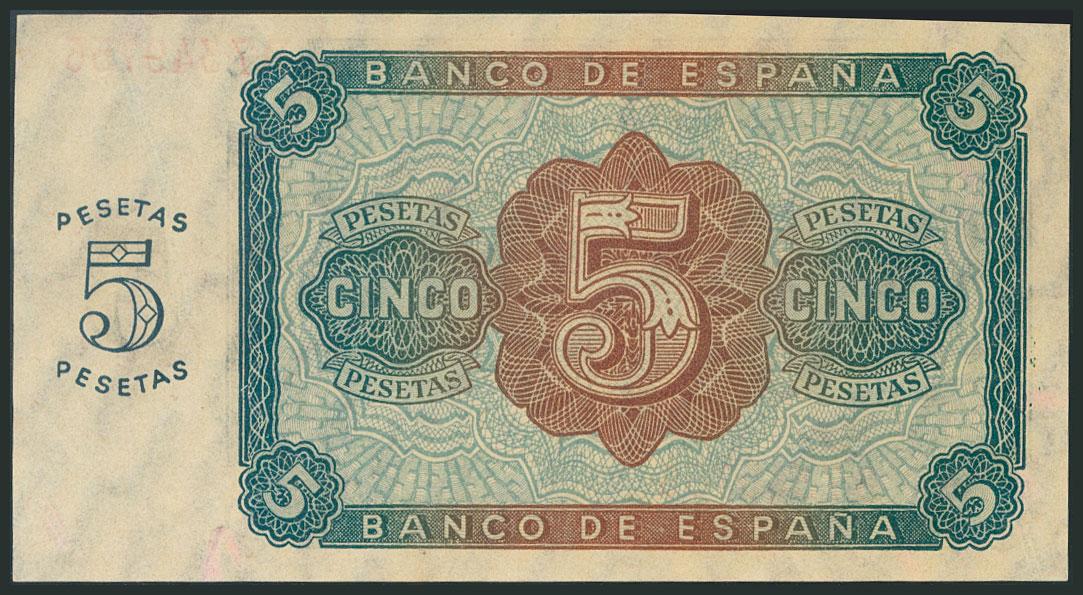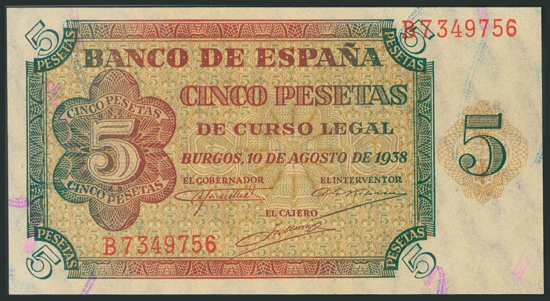 5 Pesetas. 10 de Agosto de 1938. Serie B. (Edifil 2017: 435a). SC-.