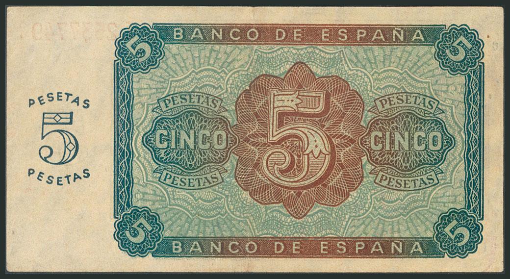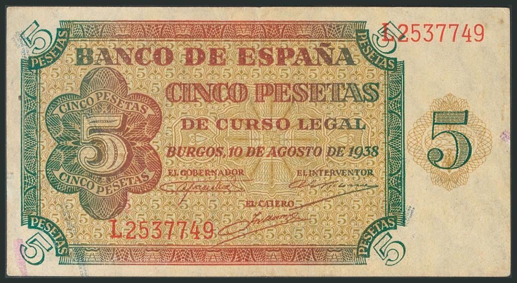 5 Pesetas. 10 de Agosto de 1938. Serie L. (Edifil 2017: 435a). EBC-.