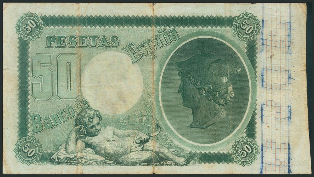 50 Pesetas. 2 de enero de 1898. (Edifil 2017: 304). Billete clásico con los dobleces habituales y sin restauración alguna. MBC+.