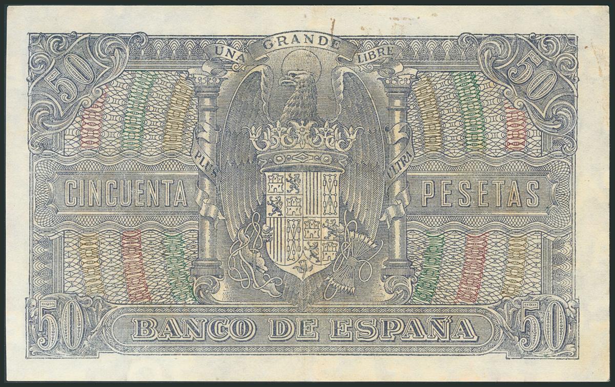 50 Pesetas. 9 de Enero de 1940. Serie D. (Edifil 2017: 437a). Expertamente reparado en el pliegue central, dándole un aspecto espectacular y muy superior a la conservación real, con un apresto muy plano y con falta de viveza. MBC+, en su estado original.