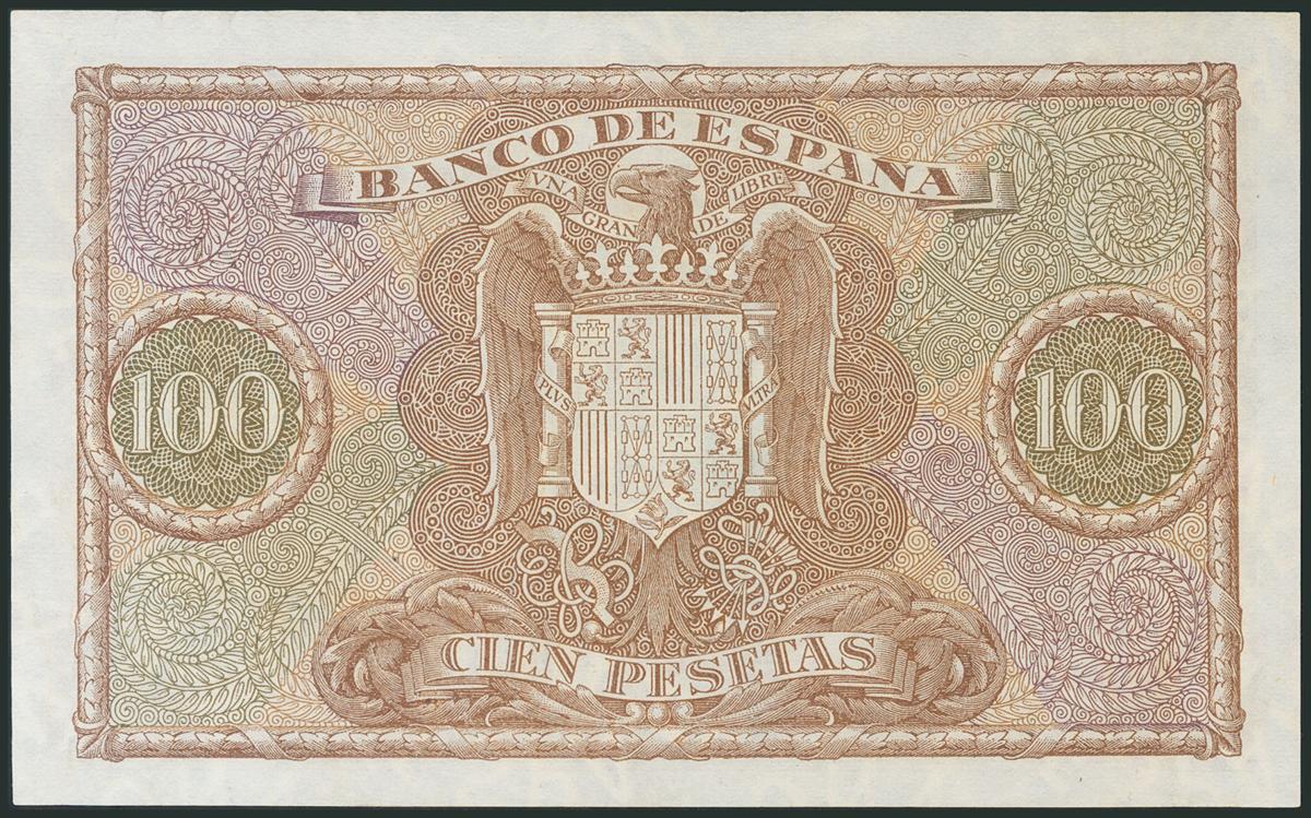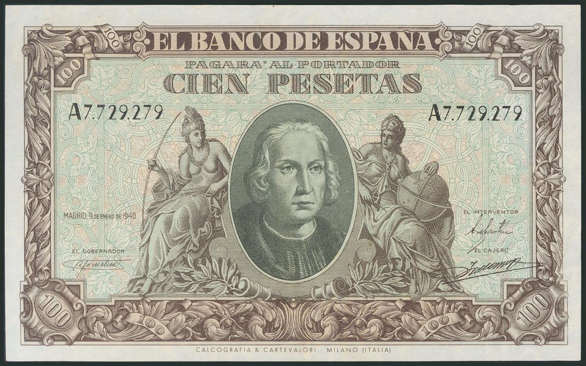 100 Pesetas. 9 de Enero de 1940. Serie A. (Edifil 2017: 438). Imperceptible doblez vertical, que no llega a romper la fibra. EBC+.