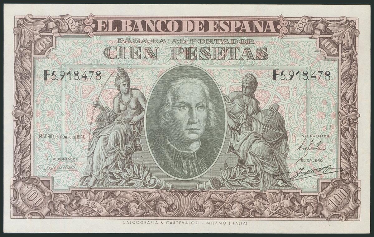 100 Pesetas. 9 de Enero de 1940. Serie F. (Edifil 2017: 438a). Apresto original. SC-.