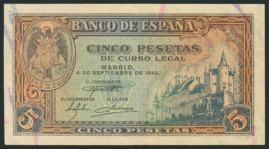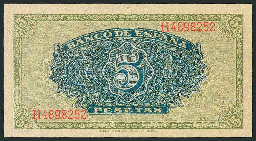 5 Pesetas. 4 de Septiembre de 1940. Serie H. (Edifil 2017: 443a). Apresto original. SC-.