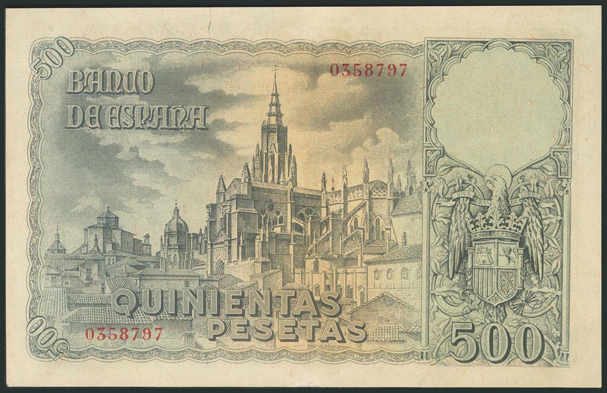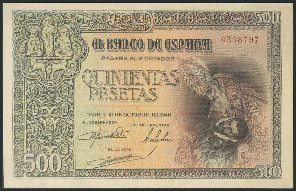 500 Pesetas. 21 de Octubre de 1940. Sin serie. (Edifil 2017: 444). Invisible doblez vertical, muy difícil de detectar, conservando gran parte del apresto original, muy raro así. EBC+.