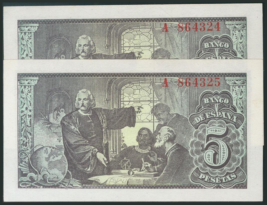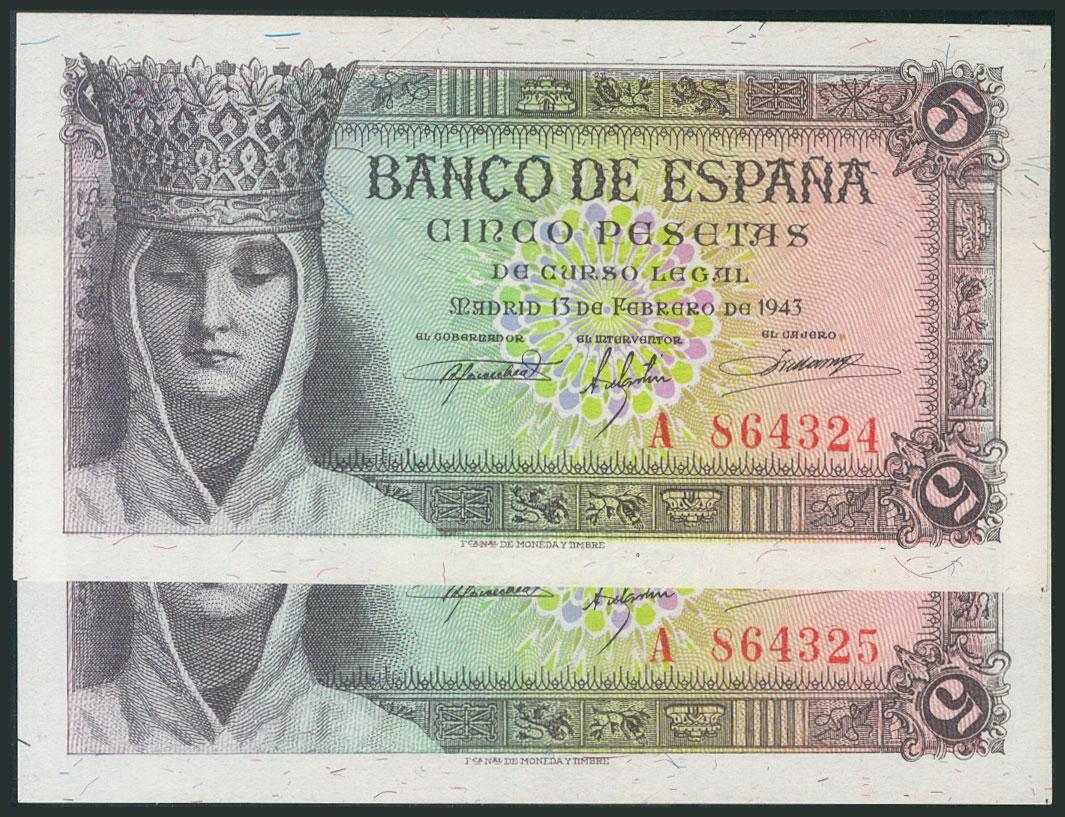 5 Pesetas. 13 de Febrero de 1943. Pareja correlativa. Serie A. (Edifil 2017: 446a). SC.
