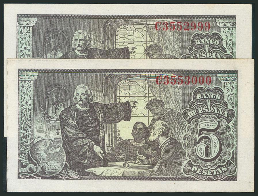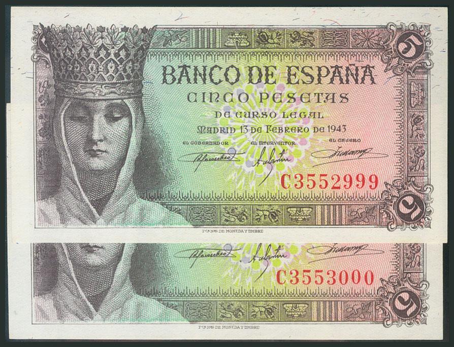 5 Pesetas. 13 de Febrero de 1943. Pareja correlativa. Serie C. (Edifil 2017: 446a). Apresto original. SC-.