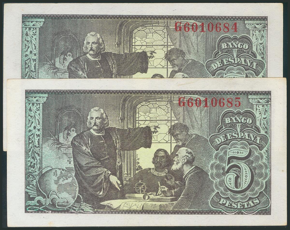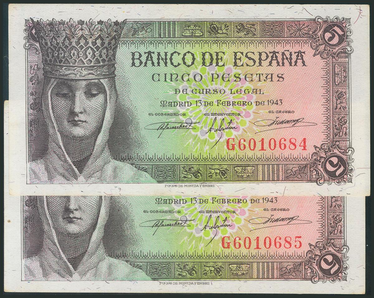5 Pesetas. 13 de Febrero de 1943. Pareja correlativa. Serie G. (Edifil 2017: 446a). EBC+.