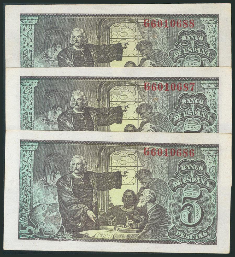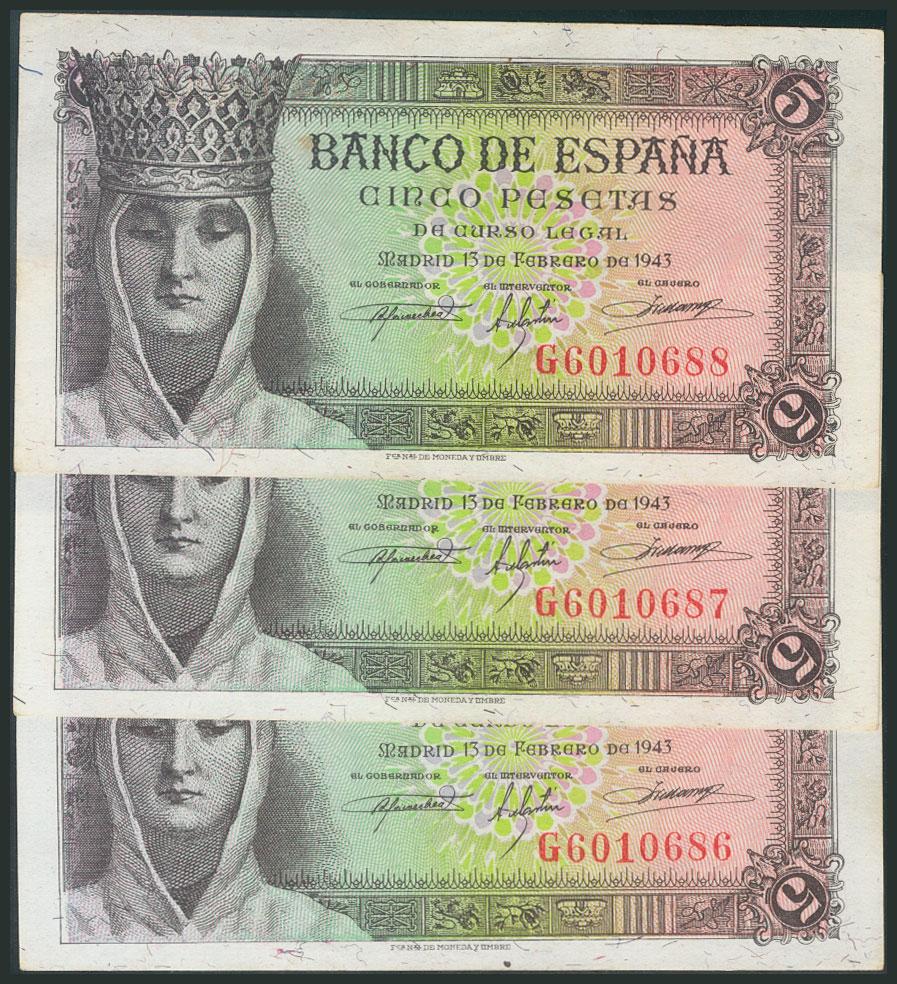 5 Pesetas. 13 de Febrero de 1943. Trío correlativo. Serie G. (Edifil 446a). Conserva gran parte del apresto original. EBC.