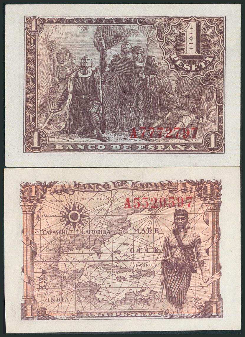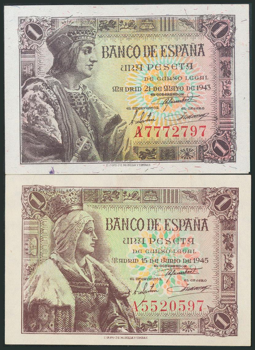 Conjunto de 2 billetes de 1 Peseta emitidos el 21 de Marzo de 1943 y el 15 de Junio de 1945, ambos serie A (Edifil 2017: 447a y 448a). SC/SC-.