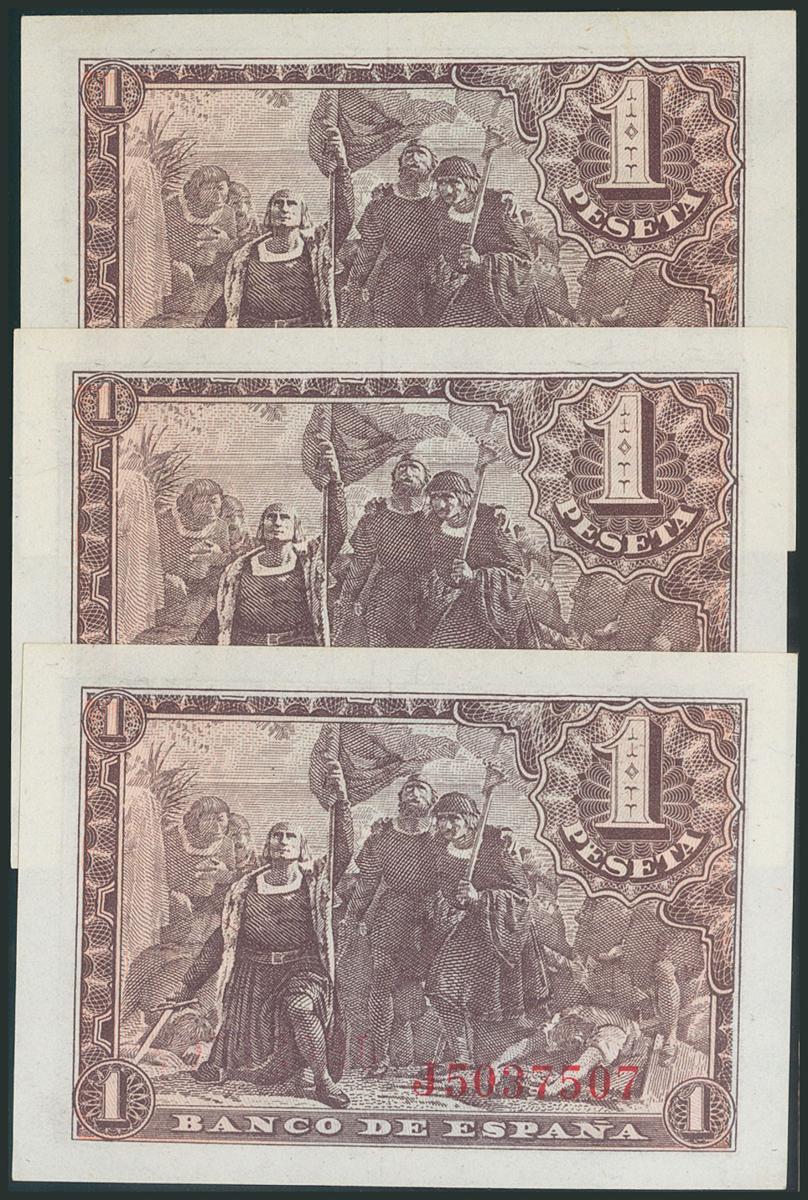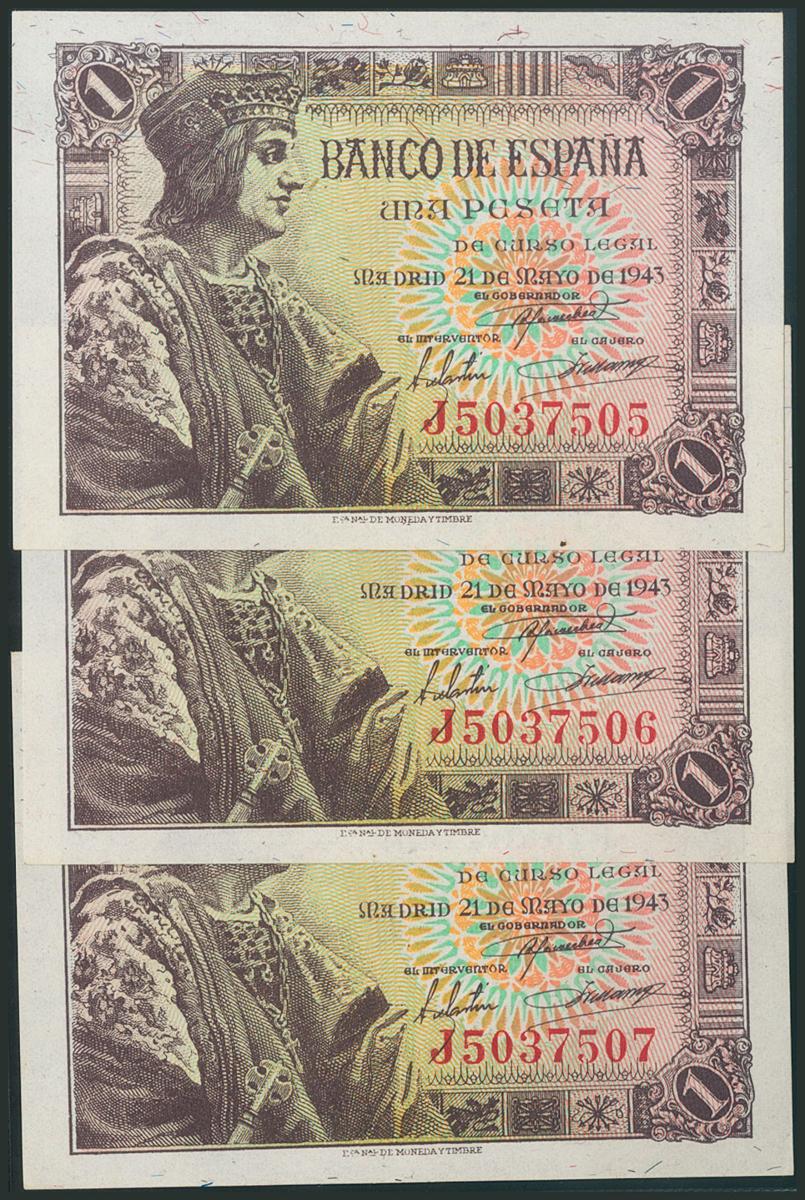 1 Peseta. 21 de Mayo de 1943. Trío correlativo. Serie J. (Edifil 2017: 447a). SC/EBC.