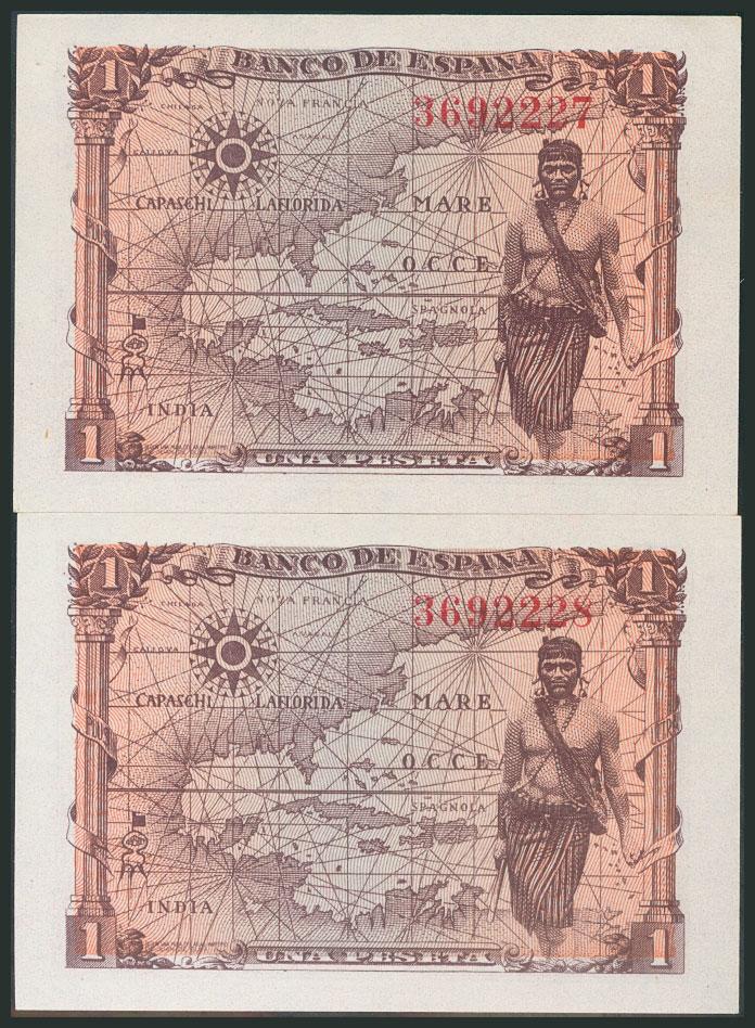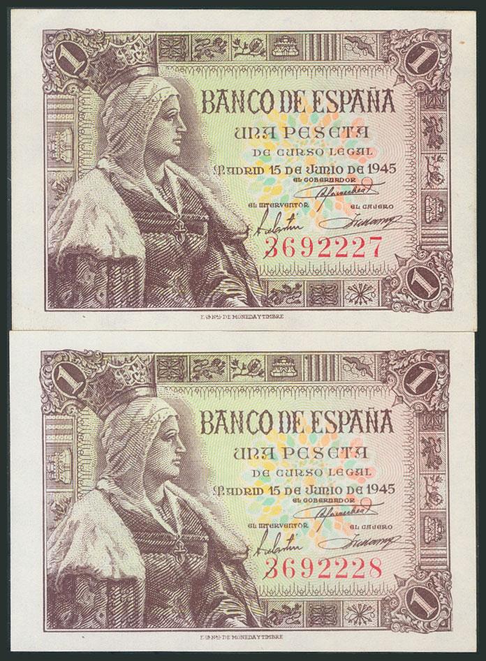 1 Peseta. 15 de Junio de 1945. Pareja correlativa. Sin serie. (Edifil 2017: 448). Apresto original. SC/SC-.