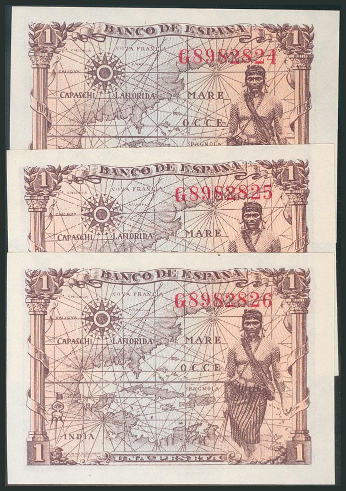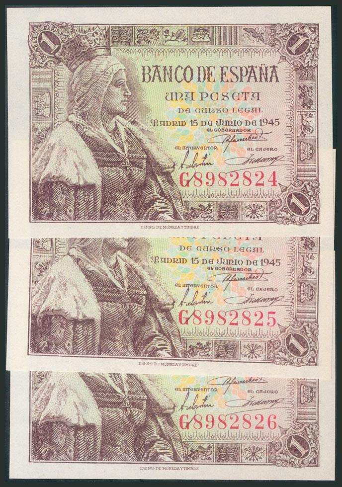 1 Peseta. 15 de Junio de 1945. Trío correlativo. Serie G. (Edifil 2017: 448a). Apresto original. SC.