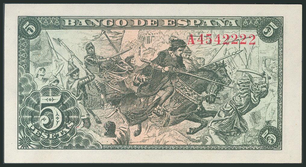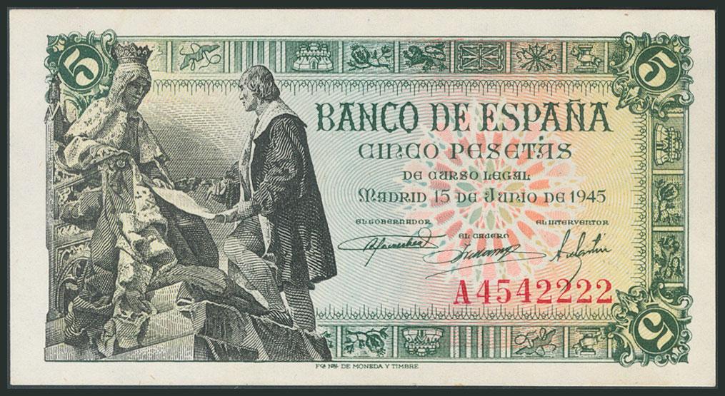 5 Pesetas. 15 de Junio de 1945. Serie A. (Edifil 2017: 449a). SC.