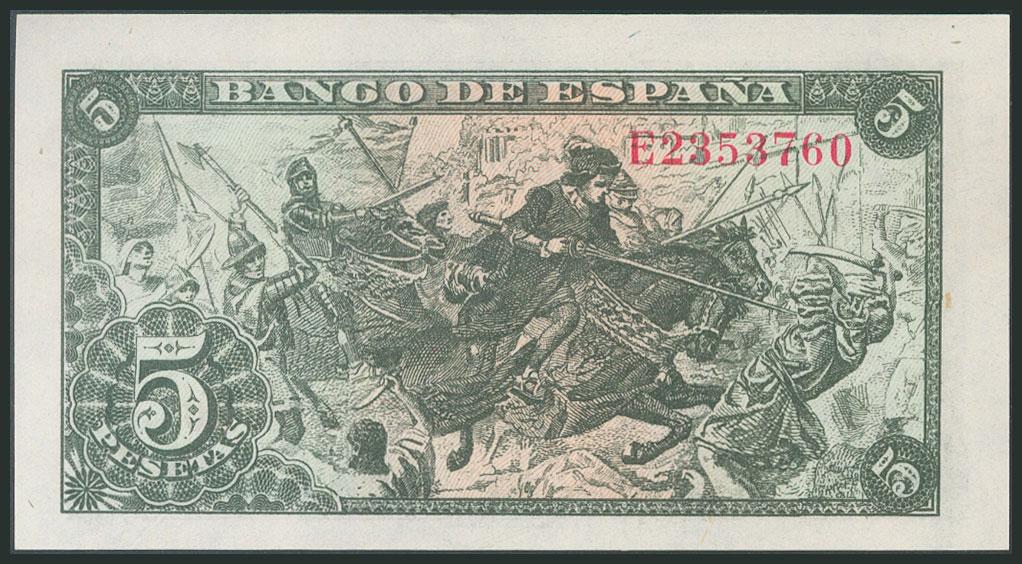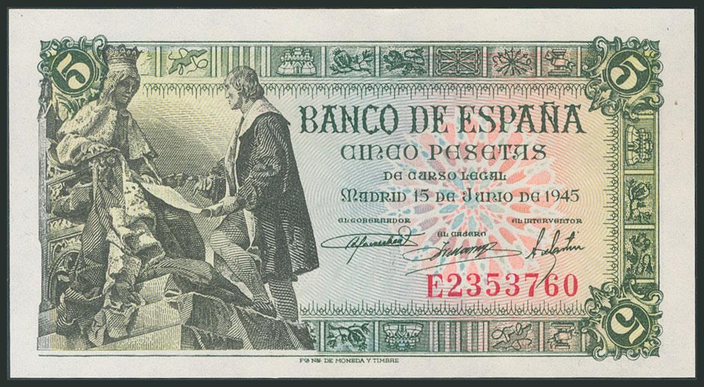 5 Pesetas. 15 de Junio de 1945. Serie E. (Edifil 2017: 449a). SC.