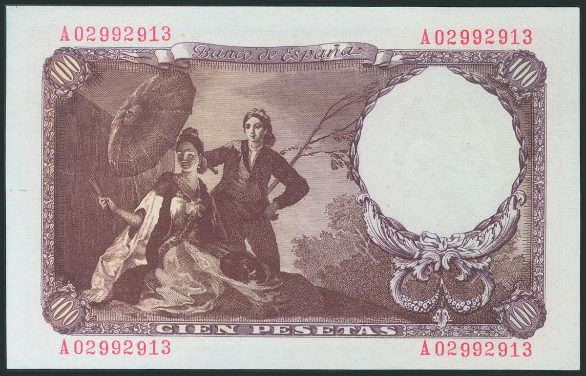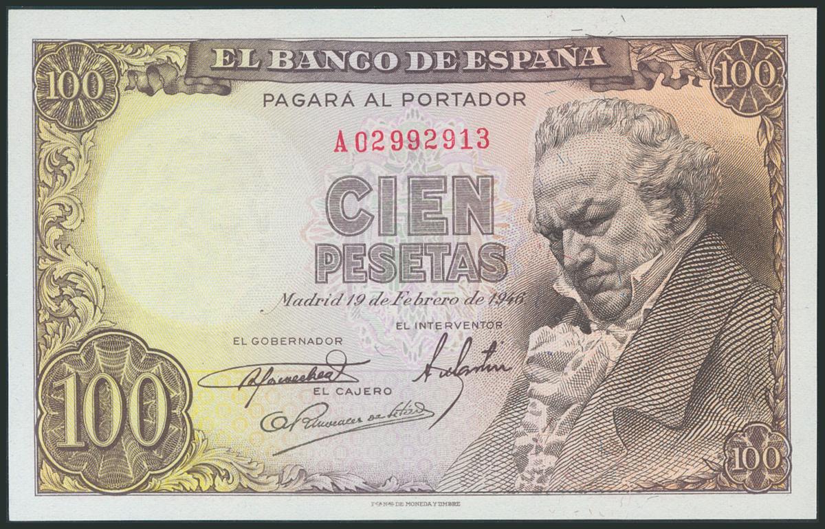 100 Pesetas. 19 de Febrero de 1946. Serie A. (Edifil 2017: 451b). Invisible doblez vertical, que obviamente no rompe la fibra, resulta muy difícil detectarlo. EBC+.