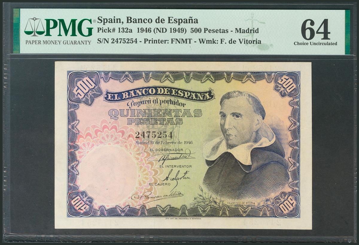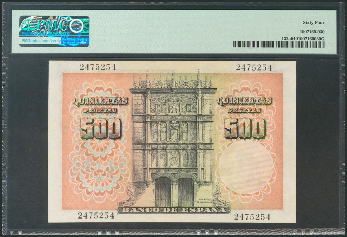 500 Pesetas. 19 de Febrero de 1946. Sin serie. (Edifil 2017: 452). Rarísimo así. SC. Encapsulado PMG64 (para hacerse una idea de la rareza de este billete en esta calidad, PMG otorga a día 1 de Septiembre de 2020 la quinta mejor calificación a este billete junto a otros cuatro billetes también calificados como 64).