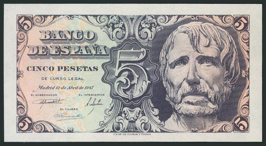 5 Pesetas. 12 de Abril de 1947. Sin serie. (Edifil 2017: 454). Apresto original. SC.