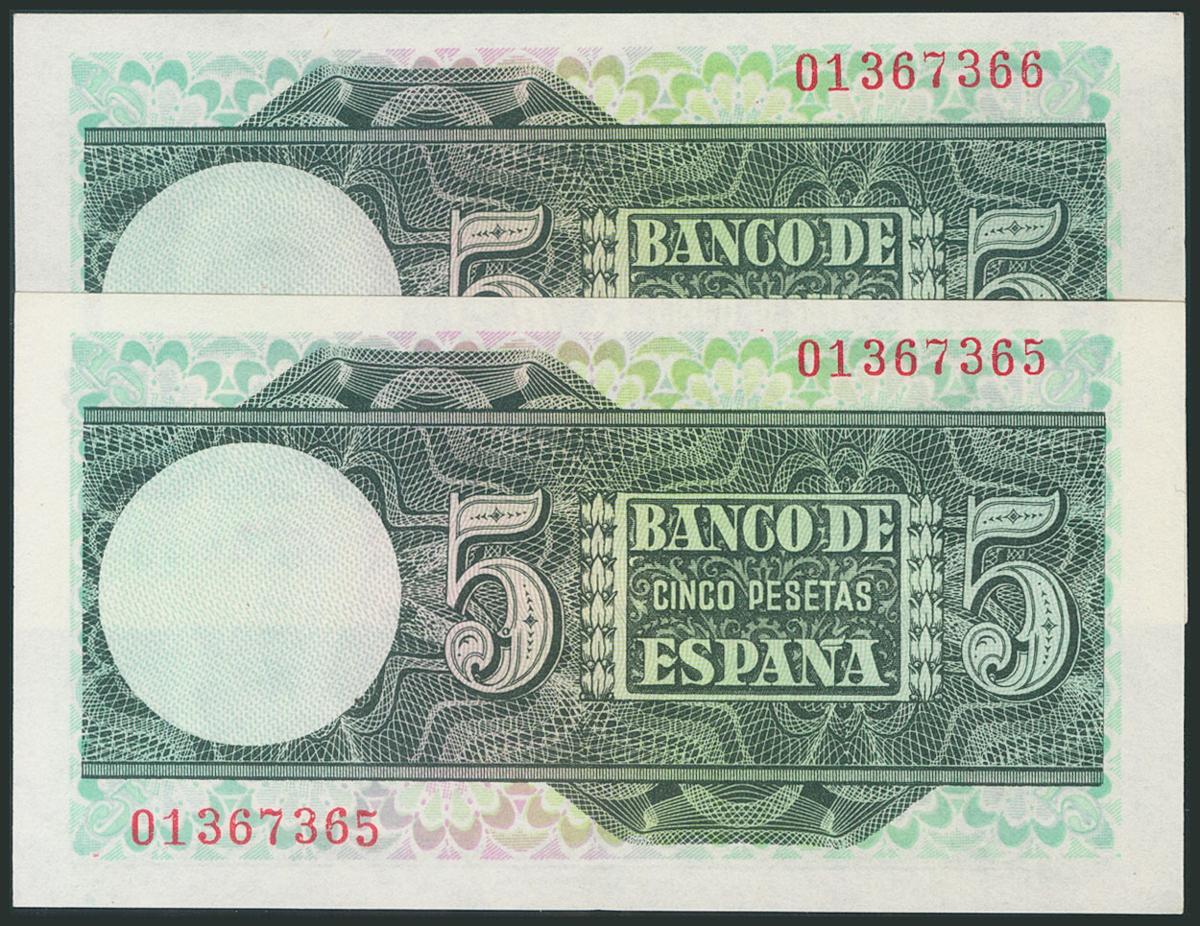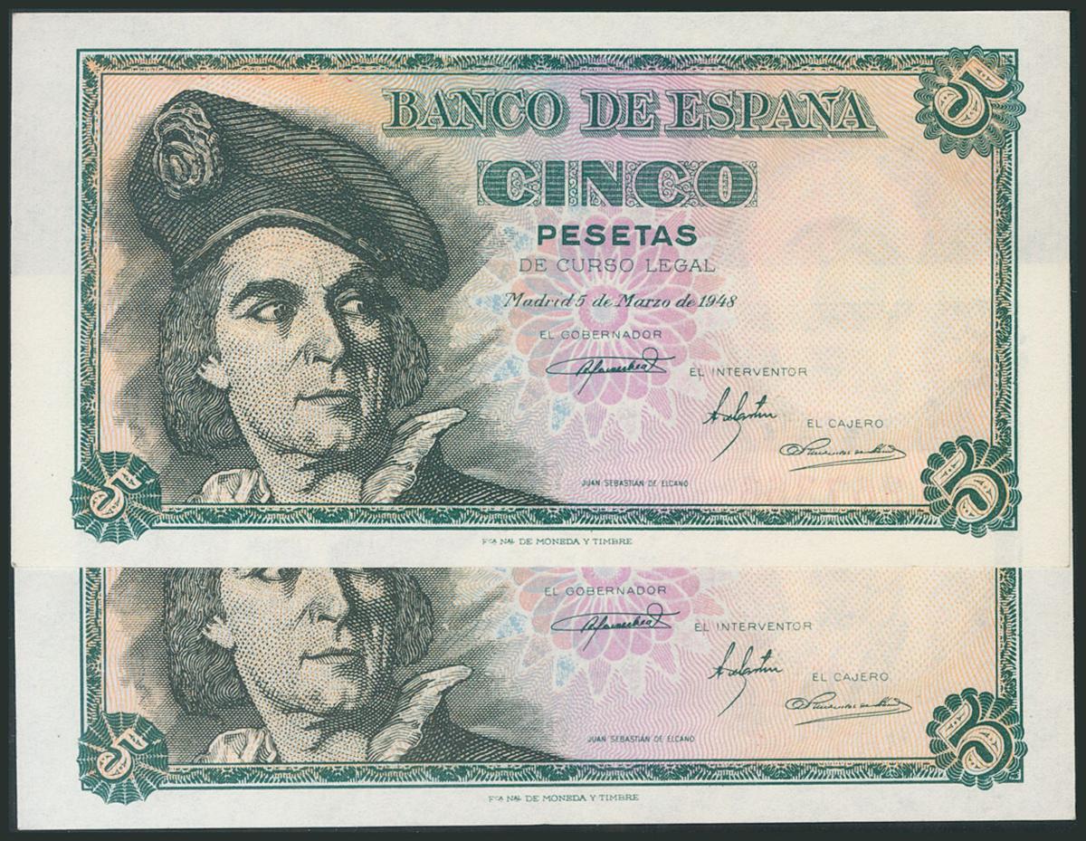 5 Pesetas. 5 de Marzo de 1948. Pareja correlativa. Sin serie. (Edifil 2017: 455). EBC+.