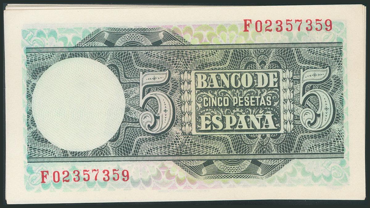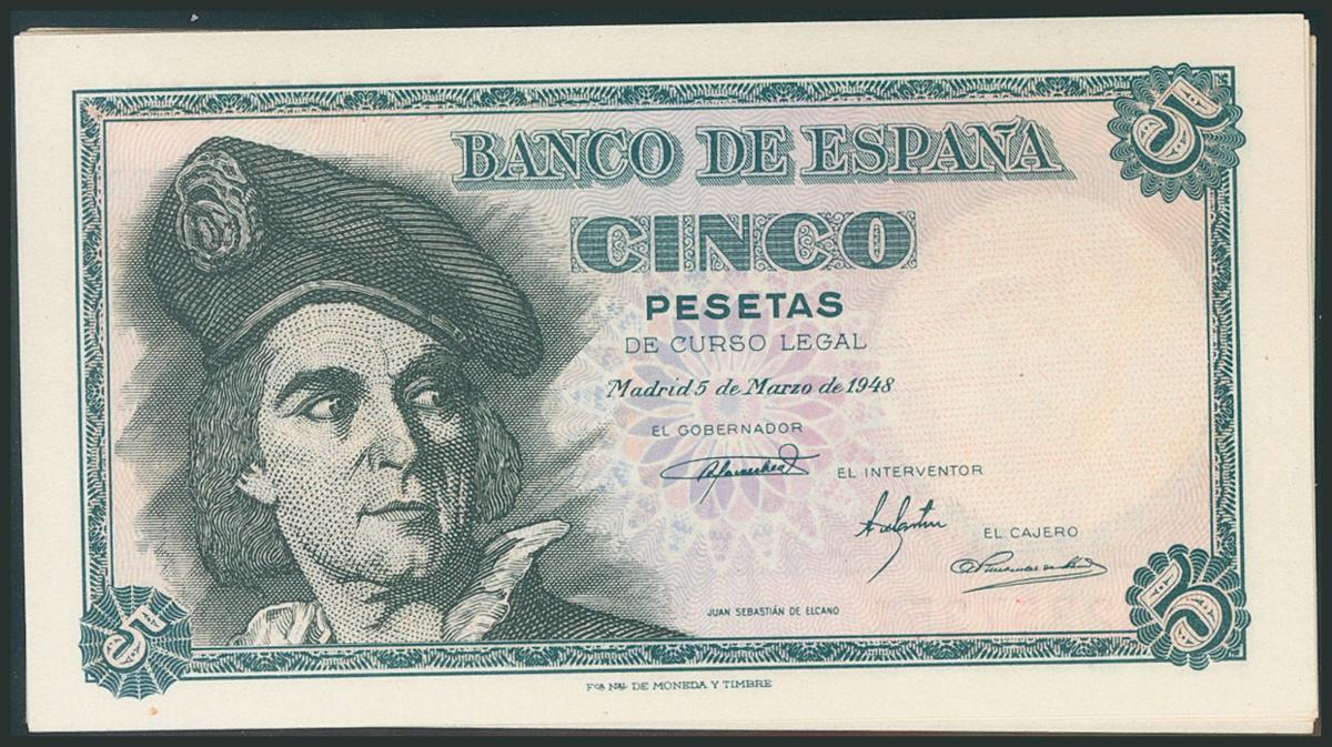Conjunto de 4 billetes correlativos de 5 Pesetas emitidos el 5 de Marzo de 1948, con la serie F (Edifil 2017: 455a). SC/SC-.