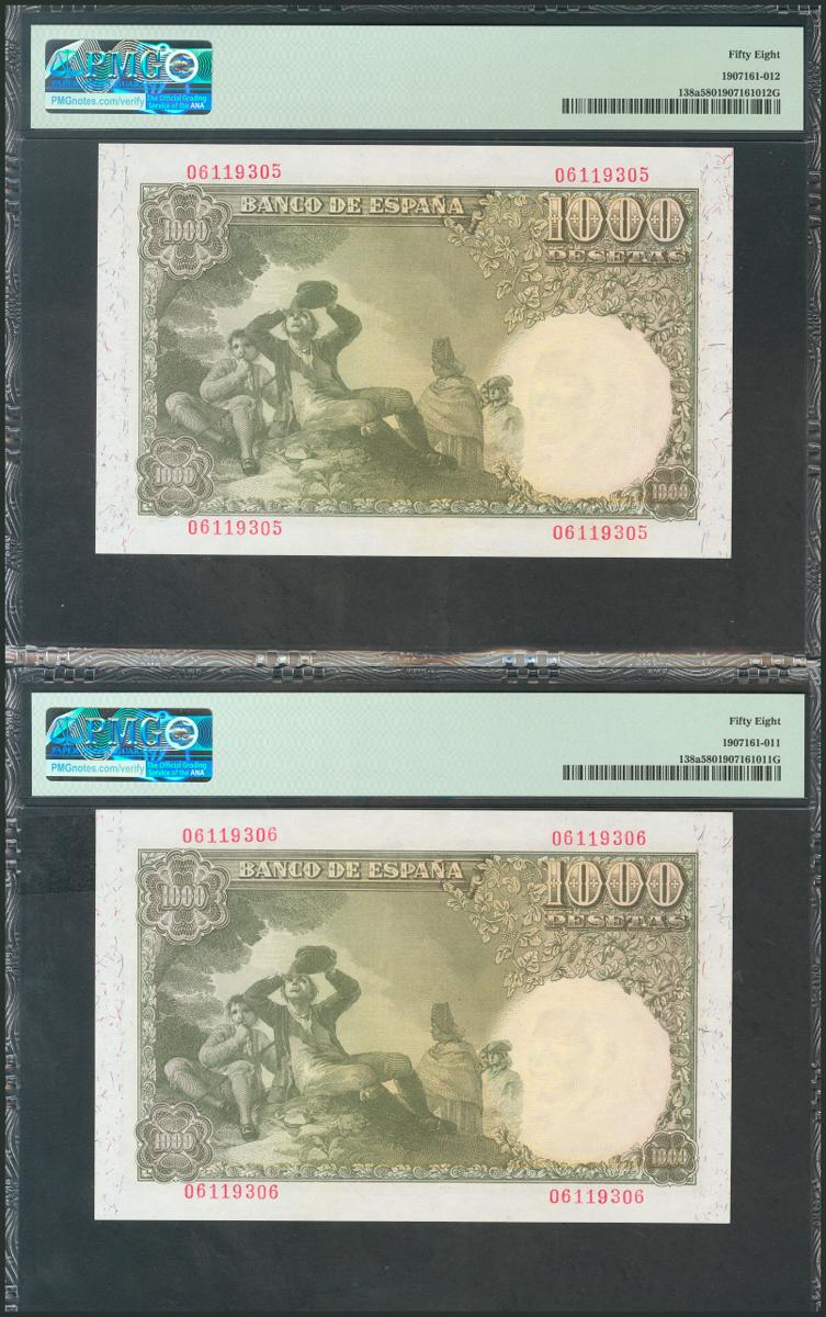 1000 Pesetas. 4 de Noviembre de 1949. Pareja correlativa. Sin serie. (Edifil 2017: 458). Rara en esta calidad. EBC+. Encapsulados PMG58, ambos.