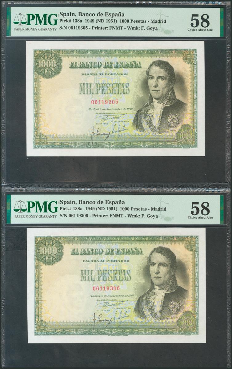 1000 Pesetas. 4 de Noviembre de 1949. Pareja correlativa. Sin serie. (Edifil 2017: 458). Rara en esta calidad. EBC+. Encapsulados PMG58, ambos.