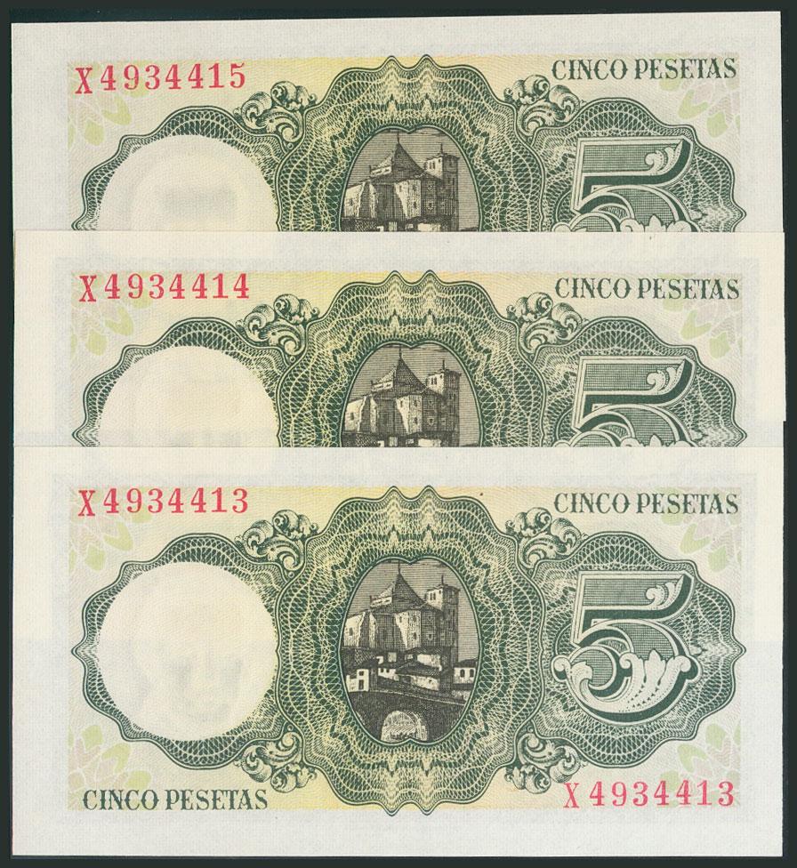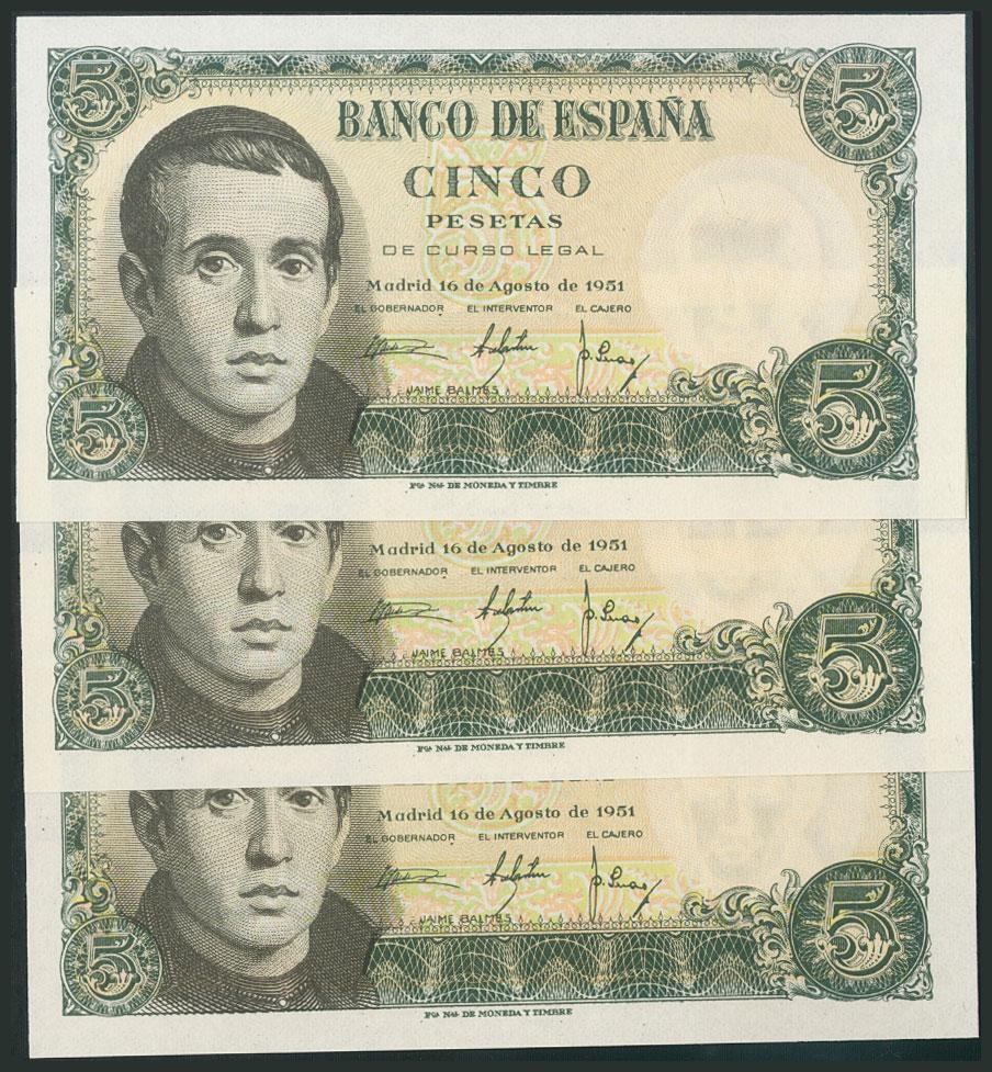 5 Pesetas. 16 de Agosto de 1951. Trío correlativo. Serie X. (Edifil 2017: 459a). SC/SC-.