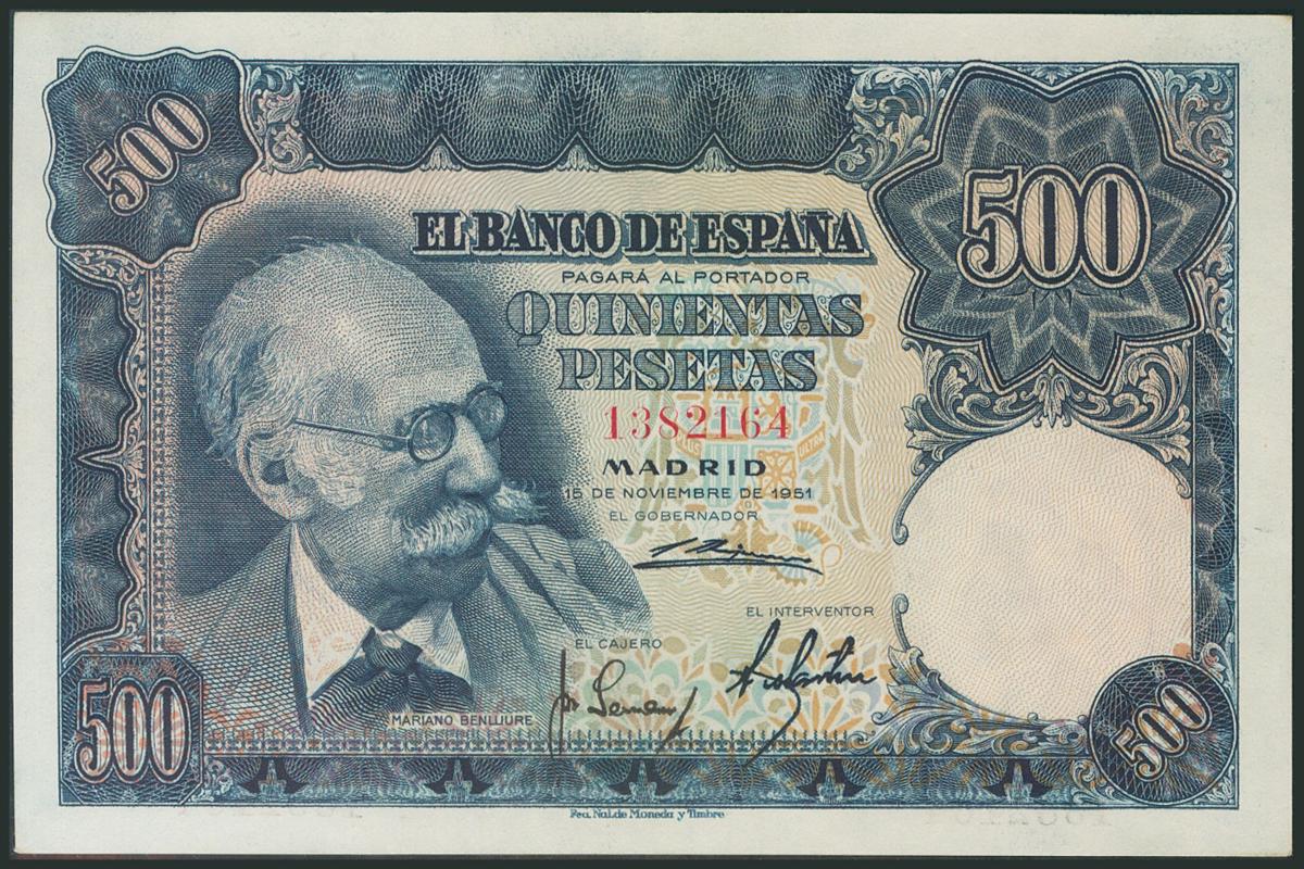 500 Pesetas. 15 de Noviembre de 1951. Sin serie. (Edifil 2017: 460). Conserva su apresto original. EBC++.