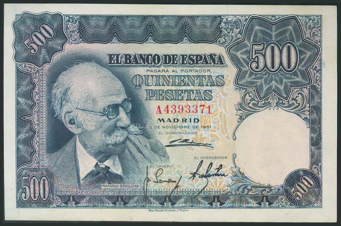 500 Pesetas. 15 de Noviembre de 1951. Serie A. (Edifil 2017: 460a). Conserva algo de apresto original. EBC+.
