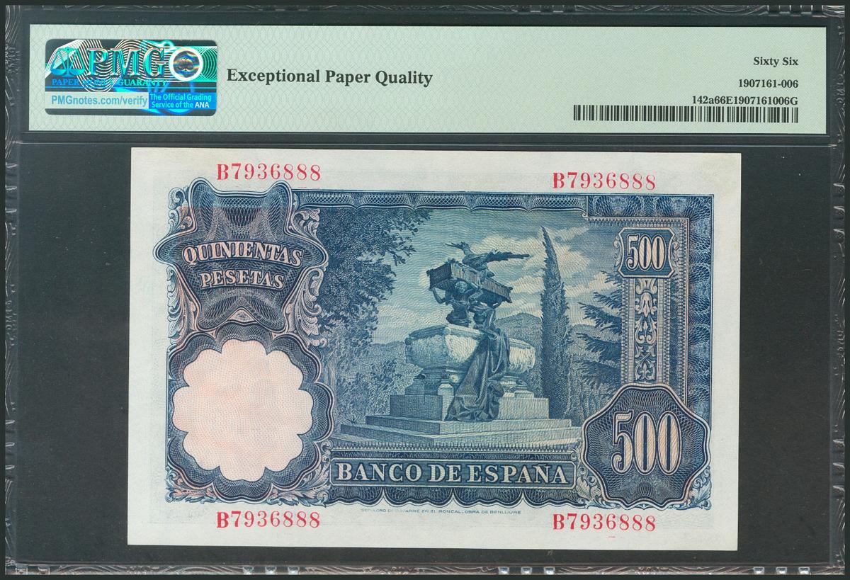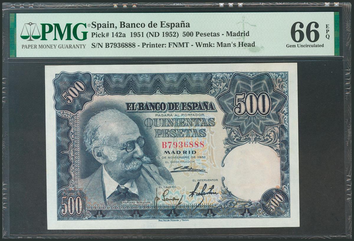 500 Pesetas. 15 de Noviembre de 1951. Serie B. (Edifil 2017: 460a). Raro así, conservando el apresto original. SC+. Encapsulado PMG66EPQ.