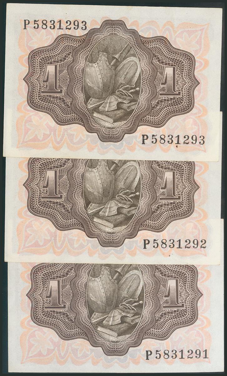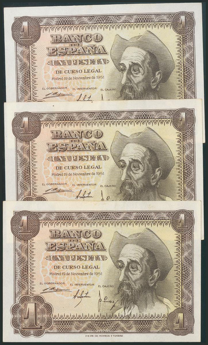 1 Peseta. 19 de Noviembre de 1951. Trío correlativo. Serie P. (Edifil 2017: 461a). SC/EBC.