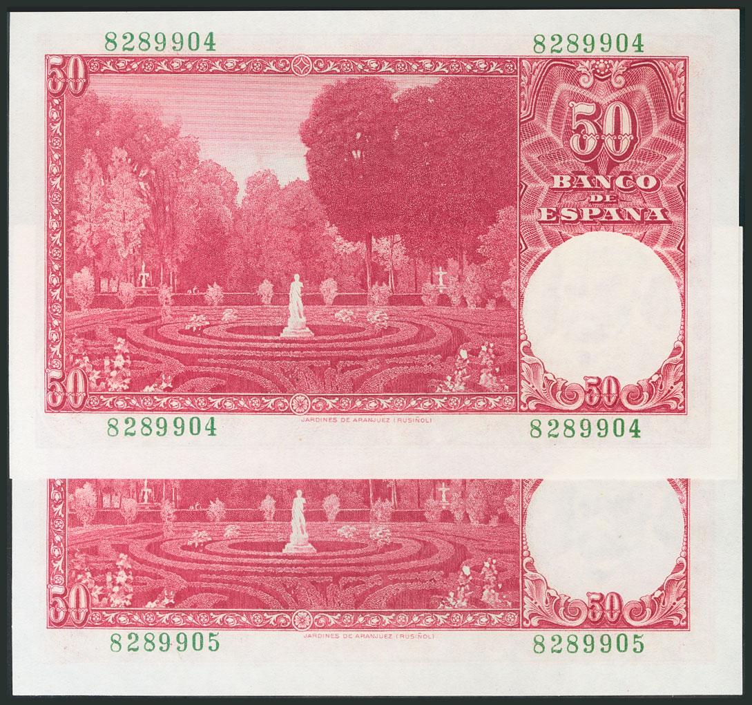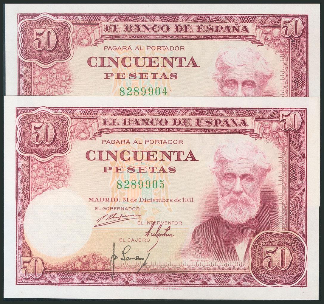 50 Pesetas. 31 de Diciembre de 1951. Pareja correlativa. Sin serie. (Edifil 2017: 462). SC.